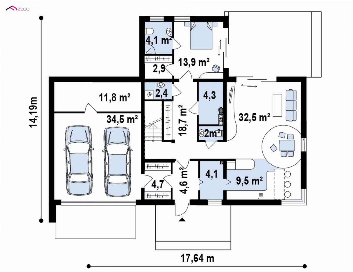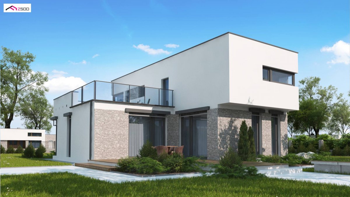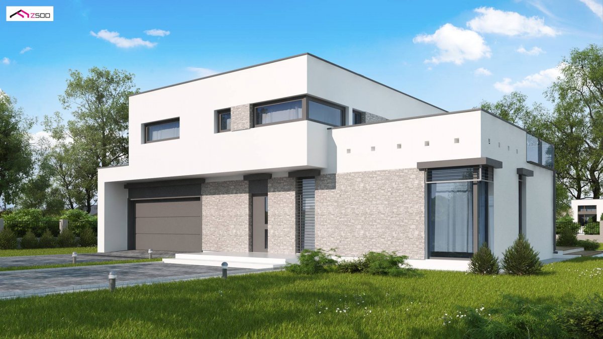 The design of a modern house Zx46 GL2 is distinguished by a modern, cubic block and details made of light stone.