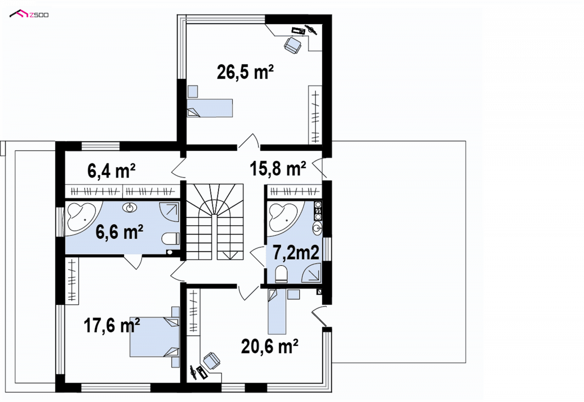 The interior of the building conceals a comfortable and spacious house. The house’s ground floor has a simple layout with a clear day zone containing a living room with fireplace , dining room and functional kitchen. This part of the house opens onto the garden through the patio door. The added value of the house is a private exit to the garden from a comfortable bedroom for a couple with their own wardrobe and bath room. The lobby connects all utility rooms and rooms. On the first floor there are three large bedrooms , a hall, a shared wardrobe and a bath room . An additional attribute is the exit to a spacious terrace, making the attic unique and original.
