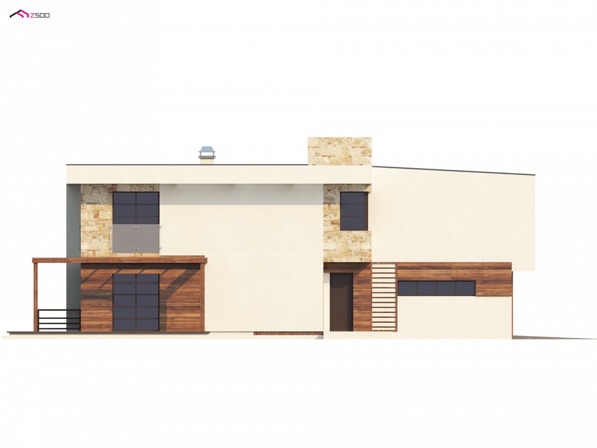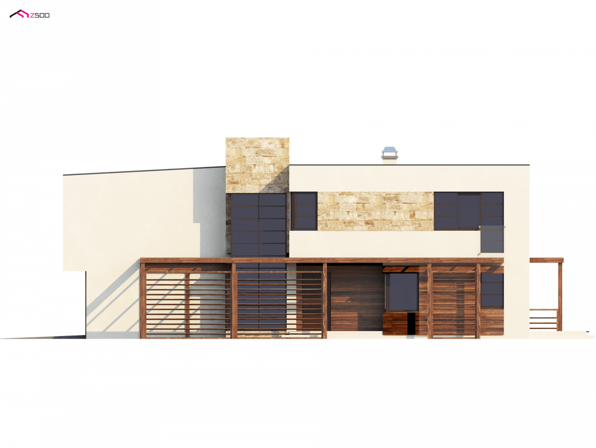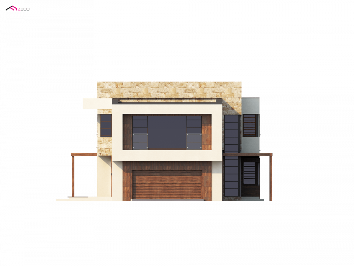 Zx14 is an innovative design of a two-story house with numerous glazing, thanks to which the environment is a natural complement to the interior space. An interesting elongated and cubic block, enriched with elements of wood and stone. A garage for two pitches and a side entrance will allow the house to be located on a narrow plot.