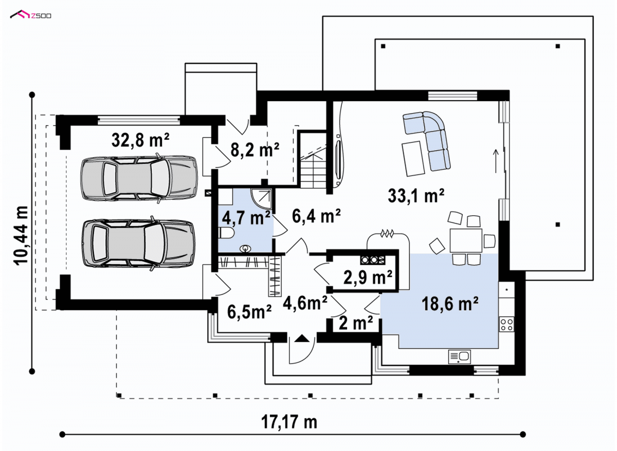 The interior of the house is primarily a spacious, bright living room . The kitchen is symbolically separated from the rest of the room by a functional dining room . The room between the kitchen and the hall – is created to facilitate shopping or as a storage space. The garage is connected to the utility room and the garden through an independent entrance.