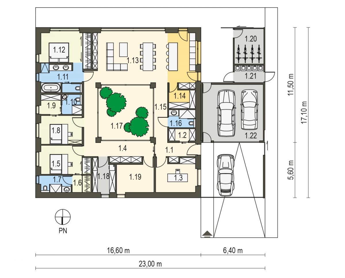 A one-story house for a family of 4-5 people, designed for a plot with entrance from the north. Clear division into day and night zones, and a combination of the whole premises with a common winter garden space are undoubted advantages of this project. It is worth appreciating the special consistency when planning the division between the residential and economic zone. The result of such a solution is great convenience and comfort of using the house.