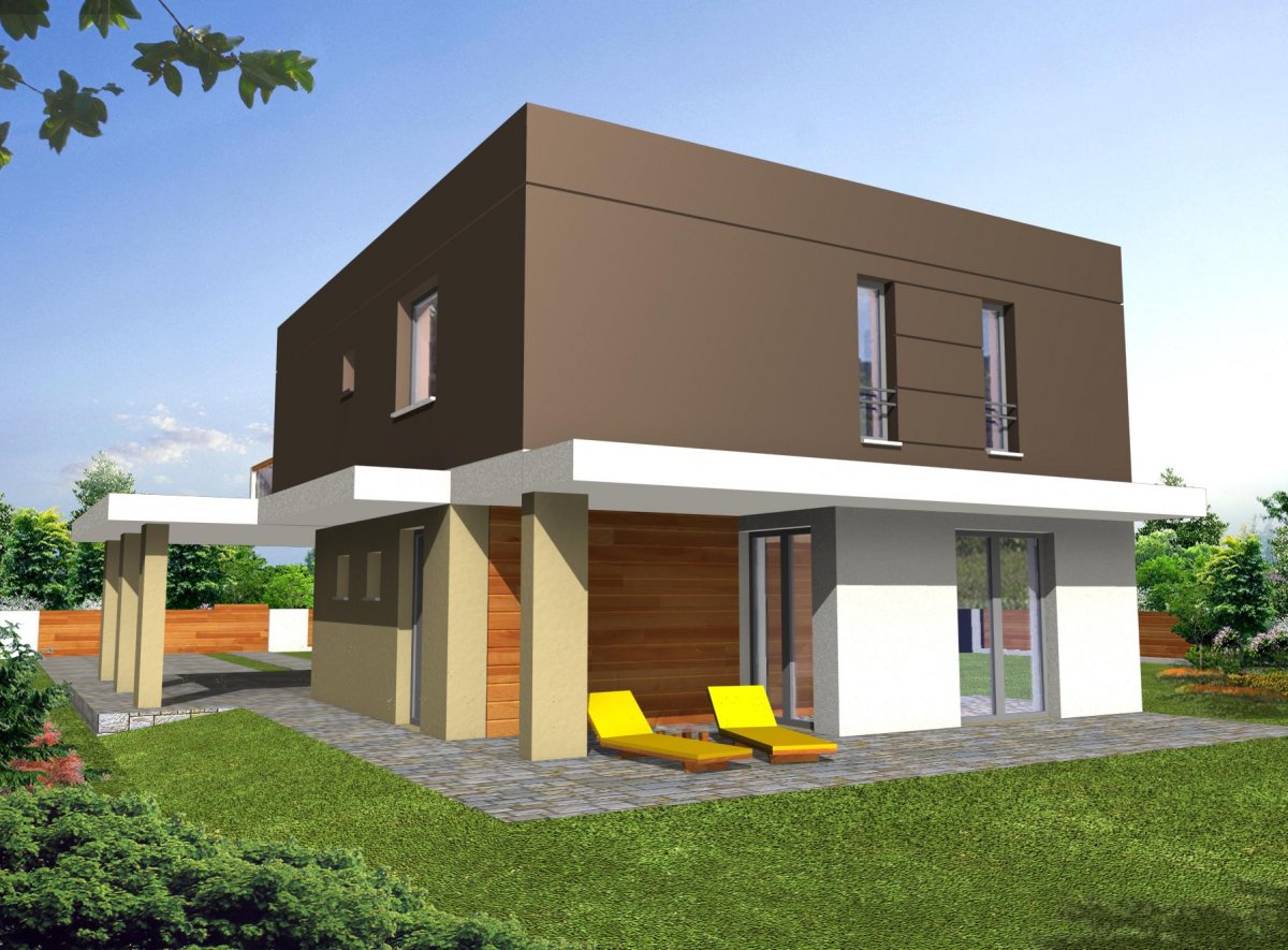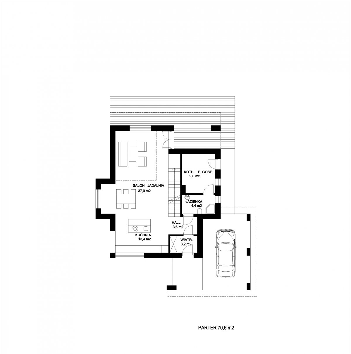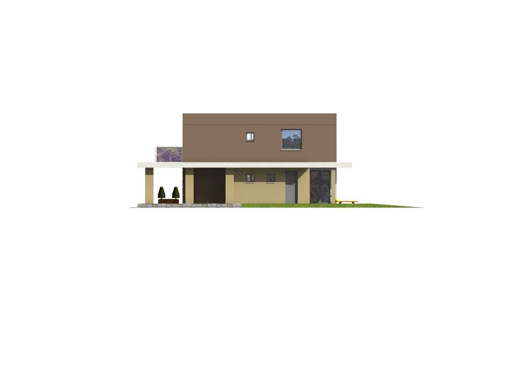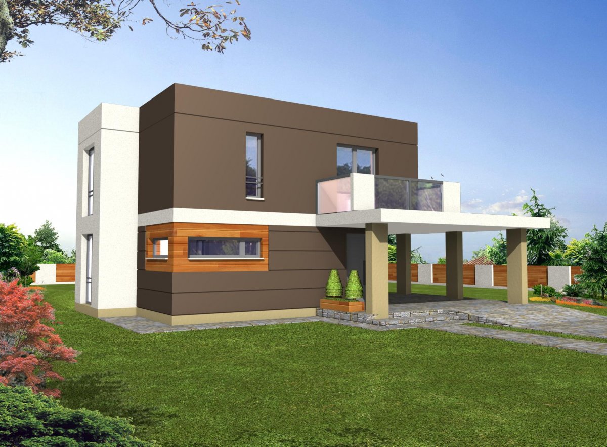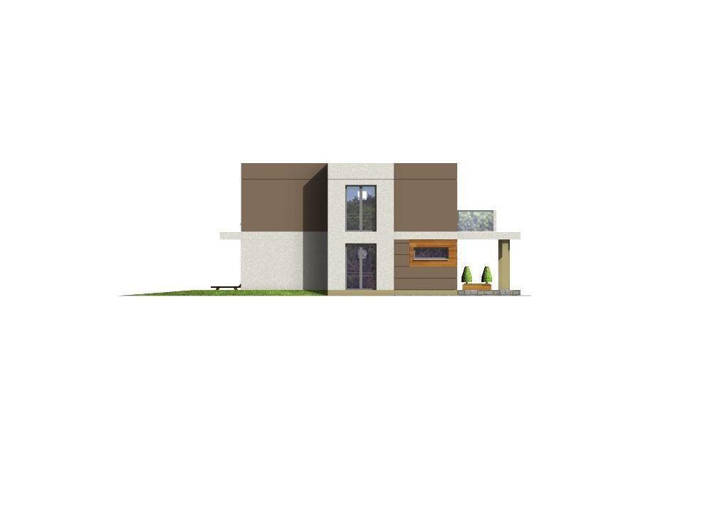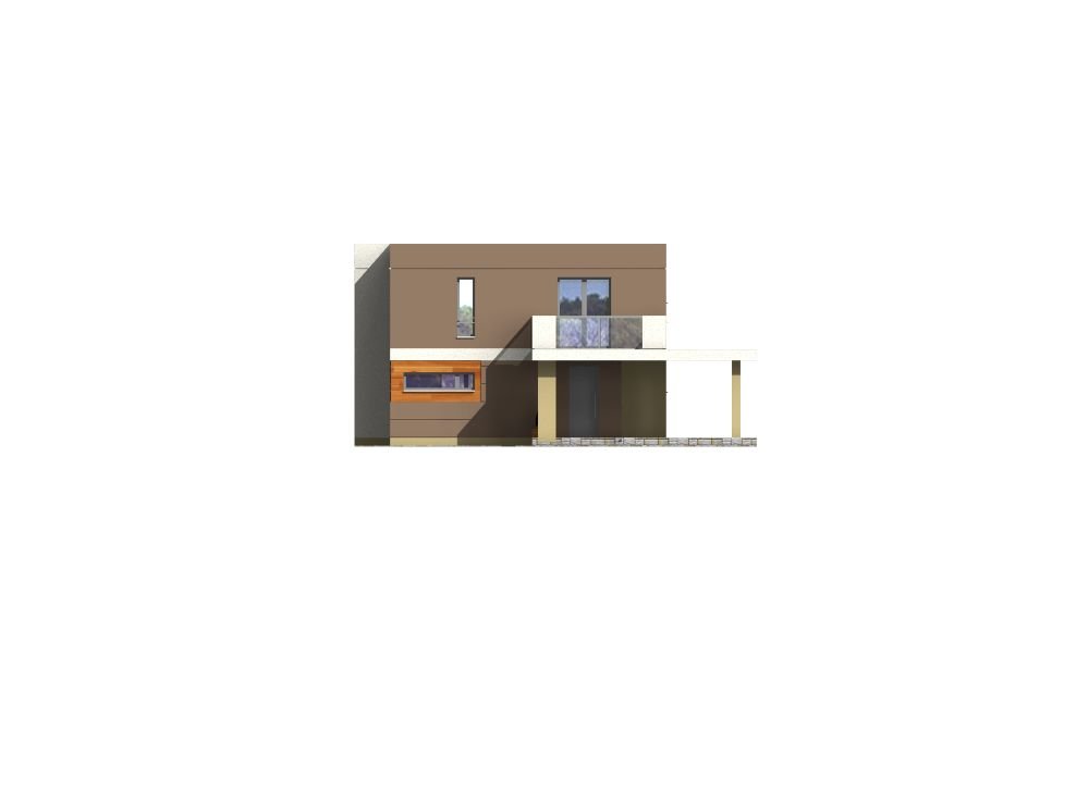 “RON” is a small, comfortable, multi-story house with a characteristic, modern architecture. On the ground floor there is a vestibule, hall, open kitchen with island, spacious dining room lit by bay windows, comfortable living room with a covered terrace, bathroom and utility room with boiler room. A roofed parking space for the car was located at the front. On the first floor there are three large bedrooms, including two with their own wardrobes, a comfortable public bathroom and communication with a partially open space above the living room. The largest bedroom at the front has its own large terrace. The house has been designed with an emphasis on functionality, reduction of implementation and operation costs due to increased energy-saving parameters.