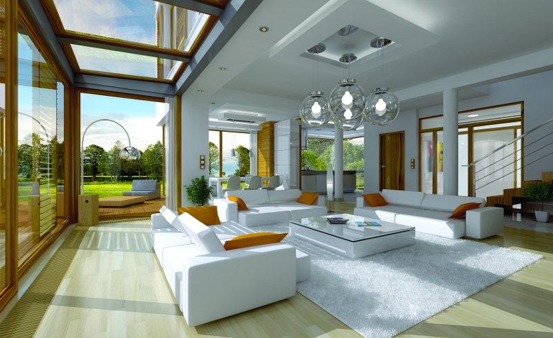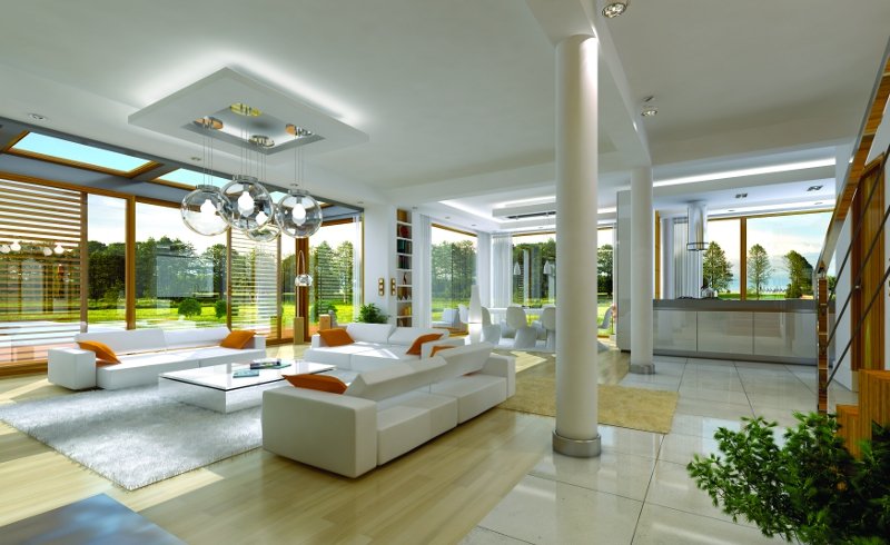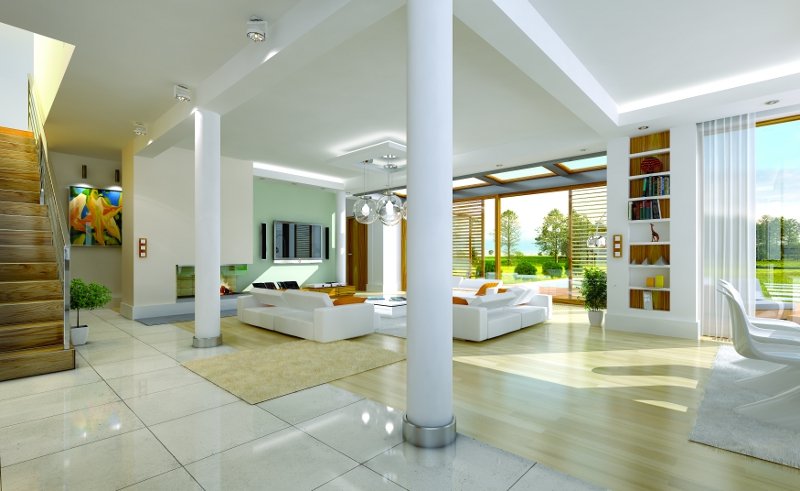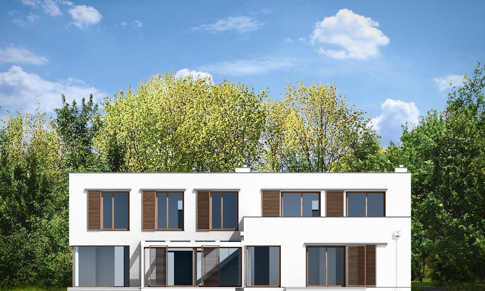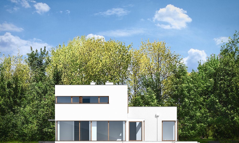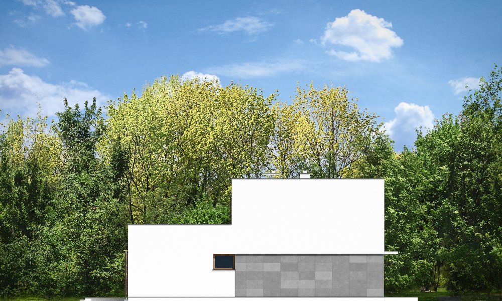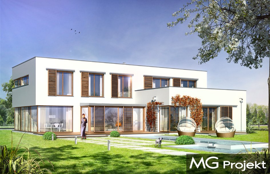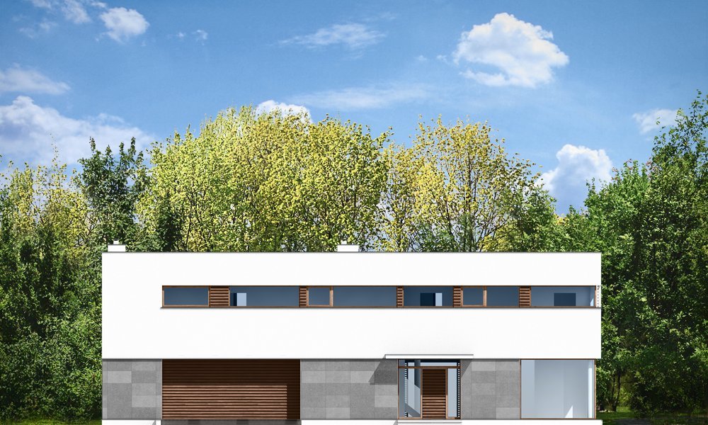 Vertigo is a building designed for a large, even a family of seven, designed in the convention of modern urban villas. The building was designed as a multi-story building with a flat roof, consisting of two rectangular cubes juxtaposed and mutually interpenetrating. The external architecture of the Vertigo house has two faces. From the front elevation, the building gives the impression of a massive, closed to the eye of strangers, with a small amount of glass, with only the accented entrance part of the vestibule with large transoms. From the garden facade, the house has a different face – open to the garden, with many glazed wall surfaces, with a conservatory between the living room interior and the terrace. From the garden side, the massive two-story building has been balanced by a one-story part and large glazing penetrating the interior. Sliding shutters and the rhythm of the windows of the floor refer to Mediterranean villas – despite the ultra-modern building line. The sense of the project was to subdue raw geometric modernity and soften it with natural materials that refer to nature. The interior of the house is divided into four parts. On the ground floor: living area – with living room, state house apartment, utility part – with garage and boiler room, and part with bedrooms on the first floor. Attention is drawn to a large single-space living interior, with a living room, dining room, hall – with representative stairs, and a kitchen. All rooms are fully open to the garden – thanks to the glass walls from floor to ceiling while in the living room or dining room – we have a garden at your fingertips. Decorations, like a conservatory in the living room, a large corner fireplace, a beautiful kitchen with a central island – perfect that the house is special and unique. A large number of rooms – e.g. sleeping rooms – will allow even a very large family to live. The studio has a mirror image of the design.