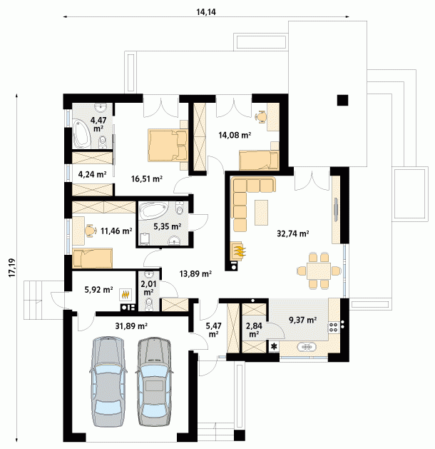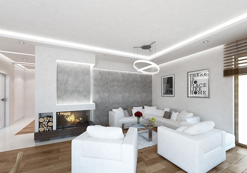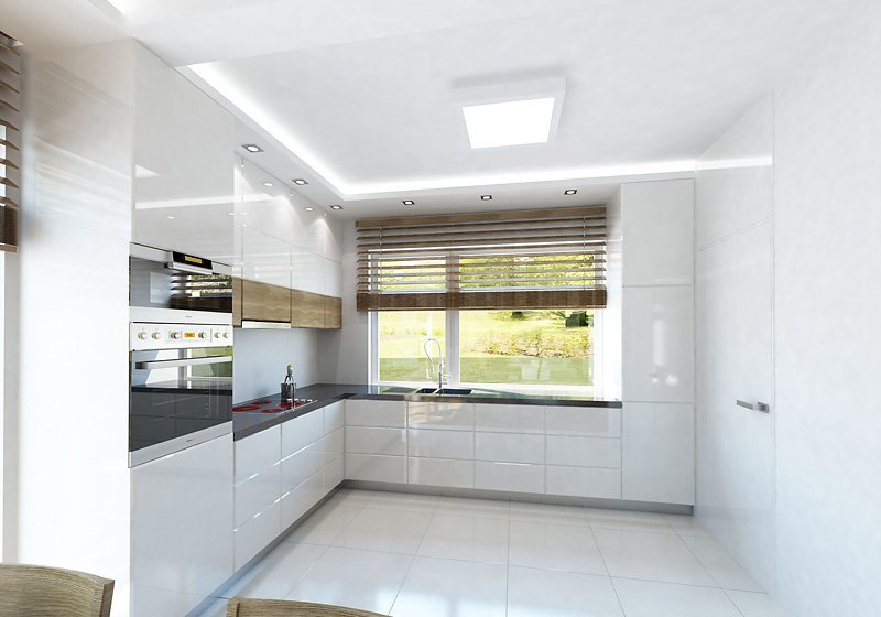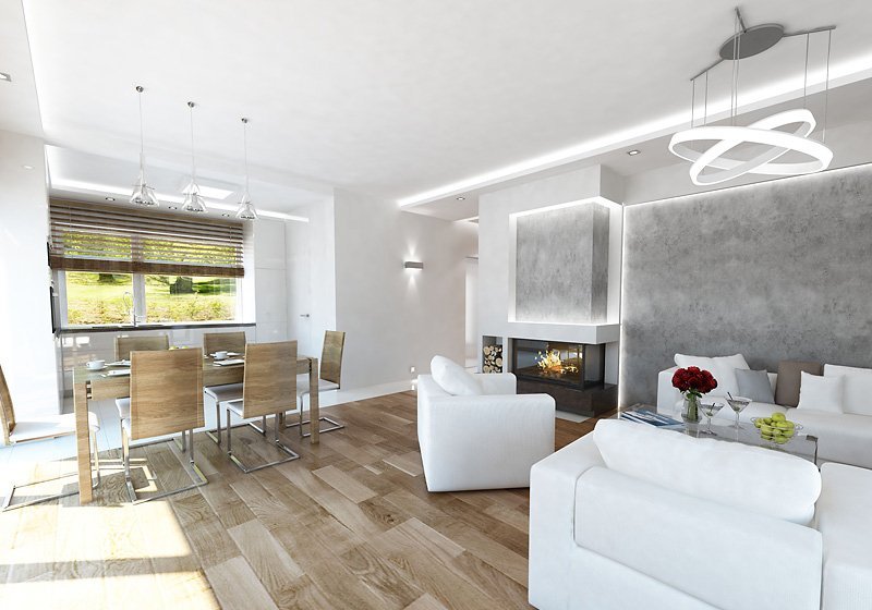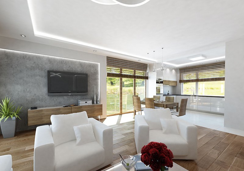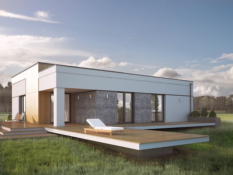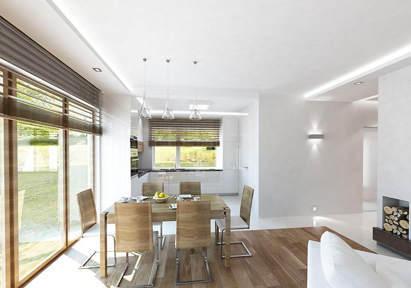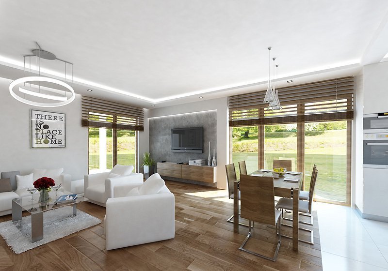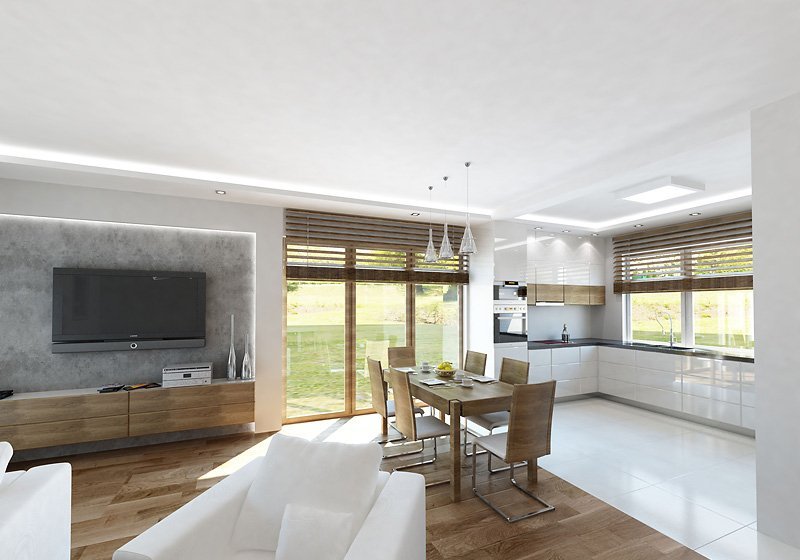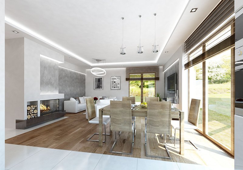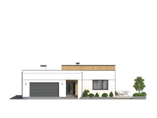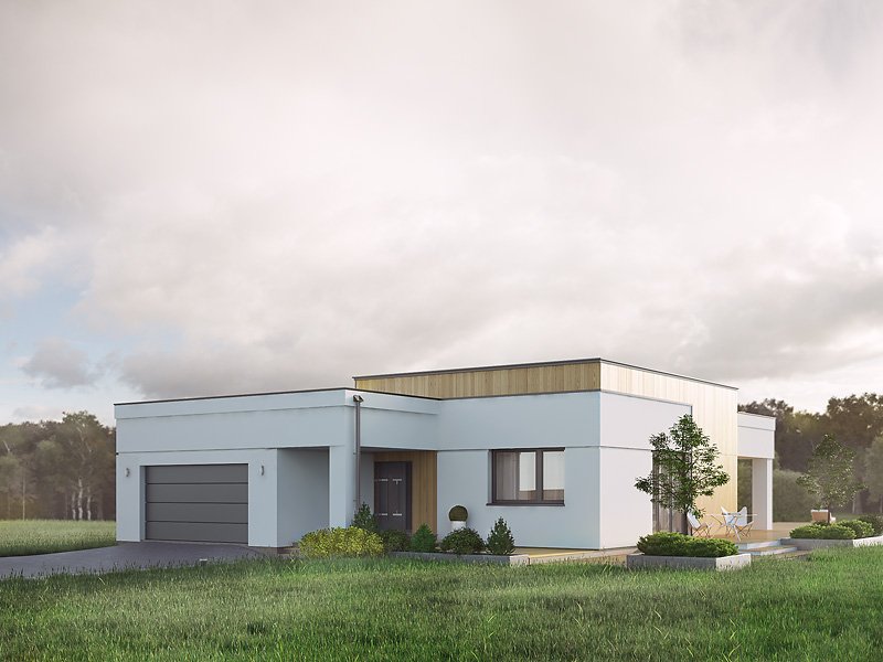 The Alibi project was intended for a family of 4. The advantage here is a clear division into day, night and economic parts. The interesting, modern block of the house attracts attention. The spacious and open living area is a living room combined with a dining room and a kitchen with a pantry. In the night part three bedrooms have been designed, including one with its own bathroom and wardrobe and a bathroom. The economic part is a boiler room, toilet and a double garage.