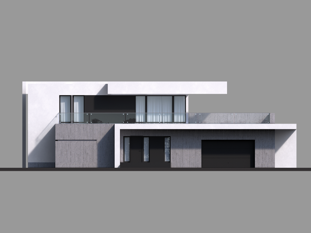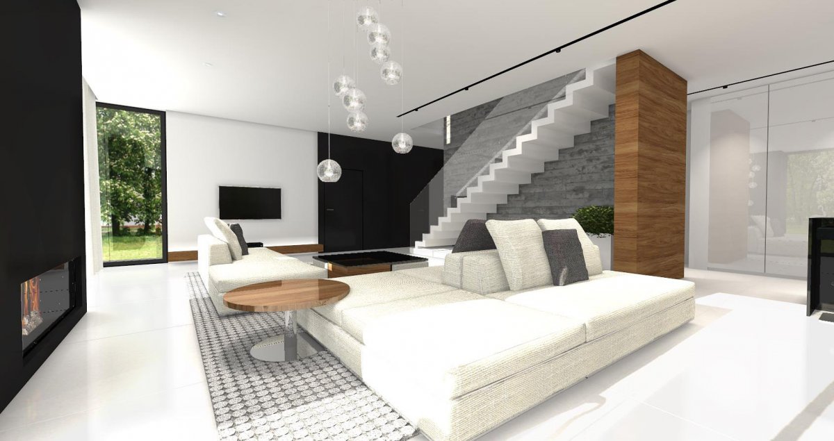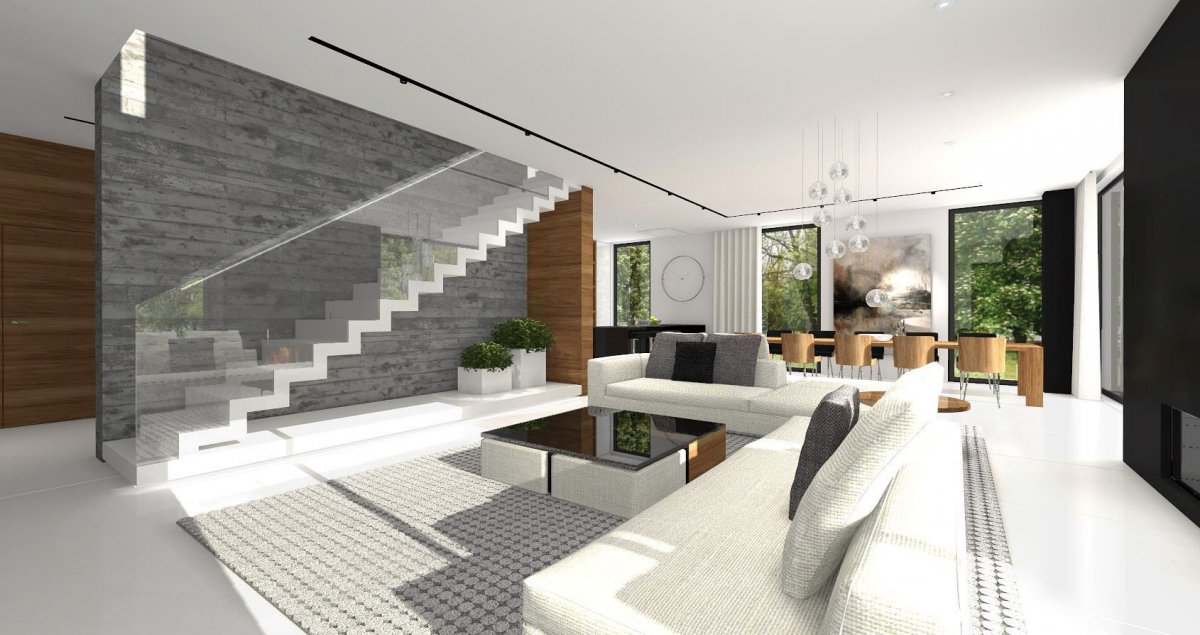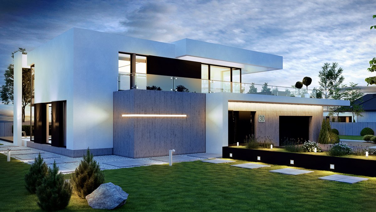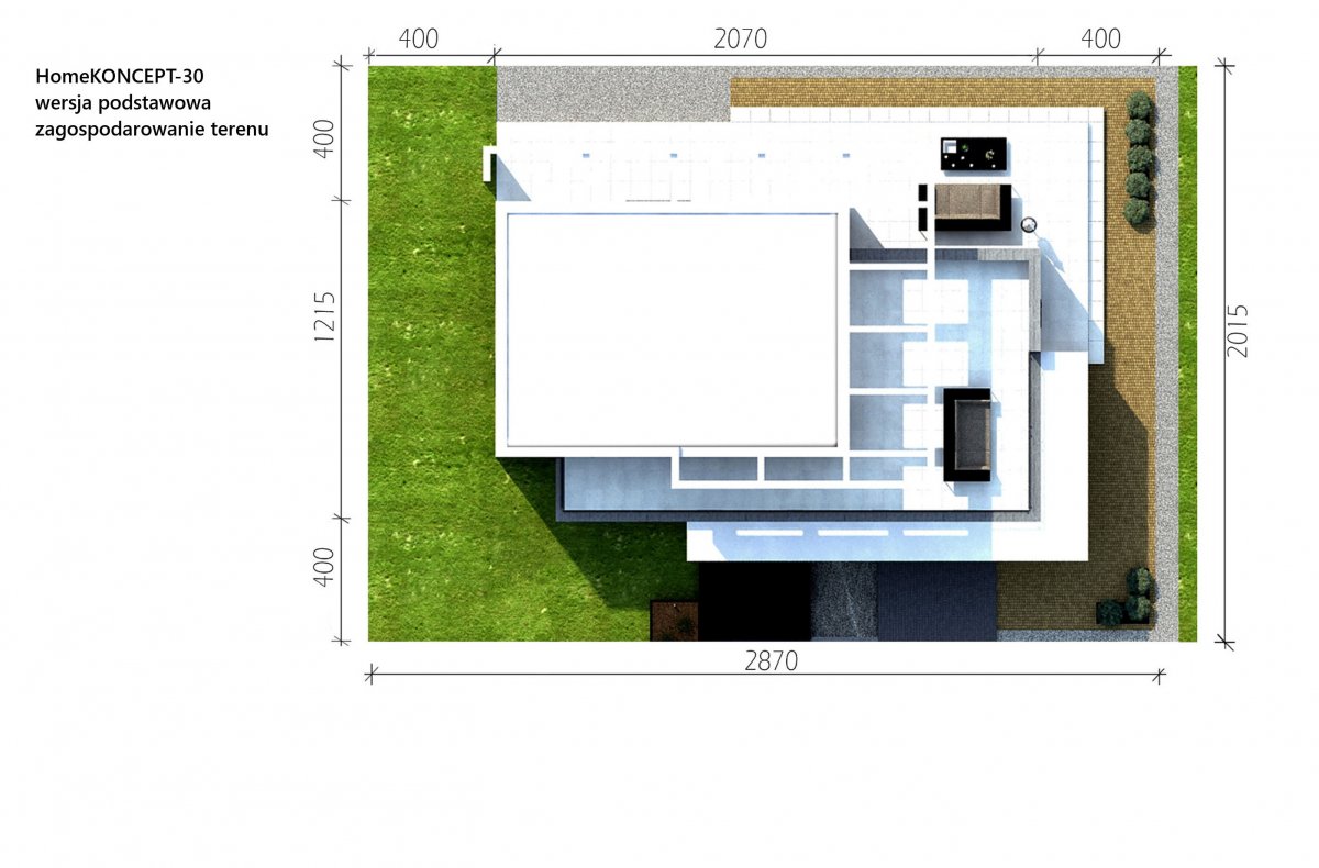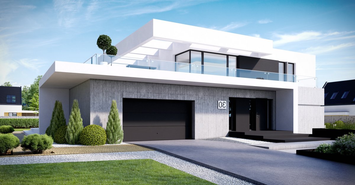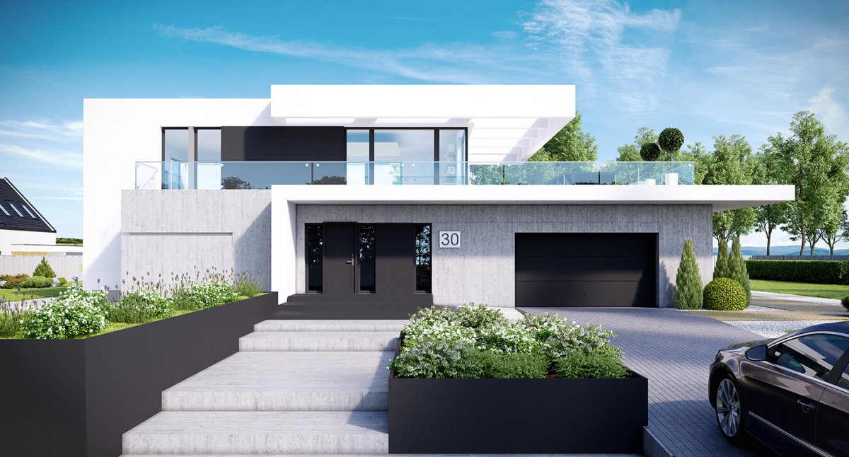 HomeKoncept 30 is a large, modern house whose spectacular shape hides a very functional interior. A unique pergola of white beams surrounds the house, giving it a unique character. The composition of colors and facade materials as well as dark window and door woodwork completes the whole.