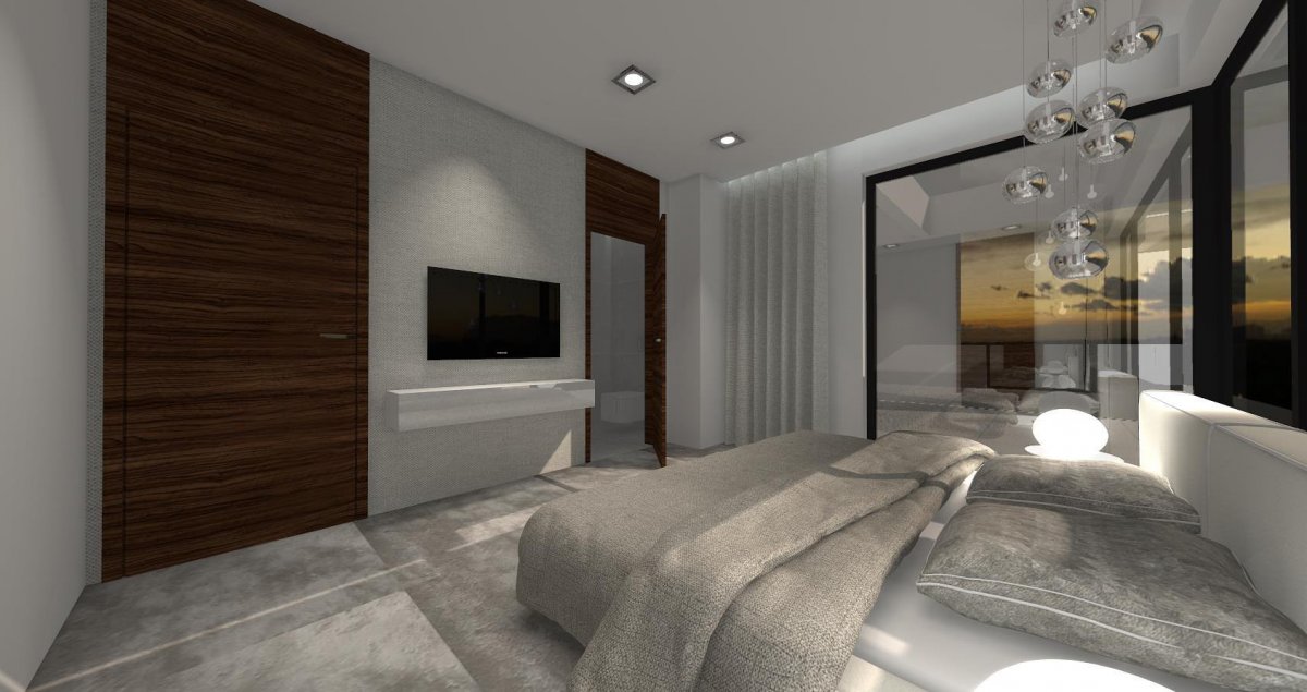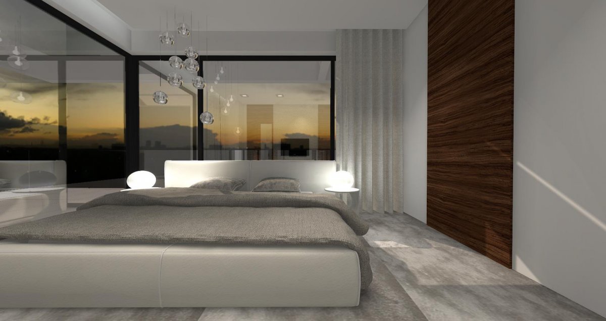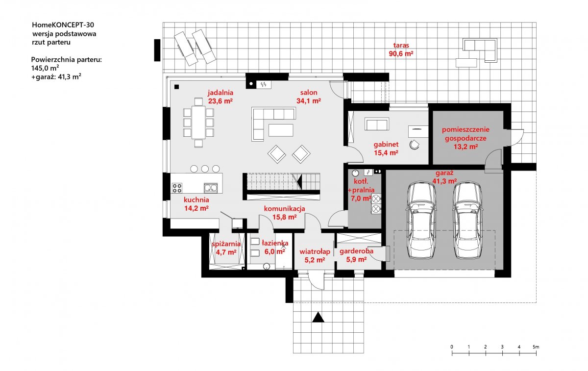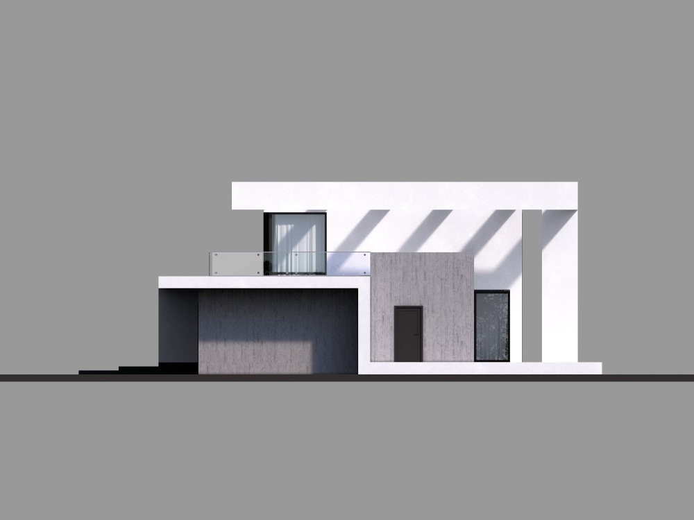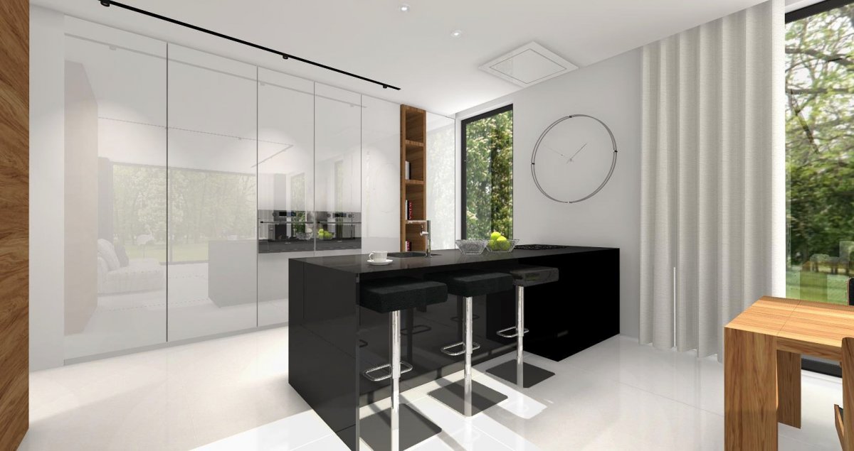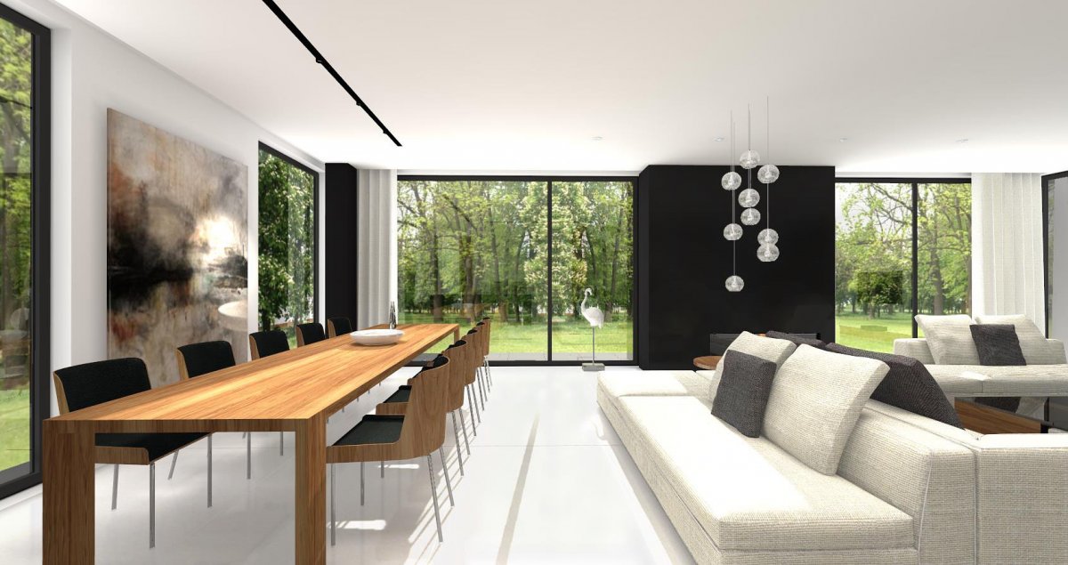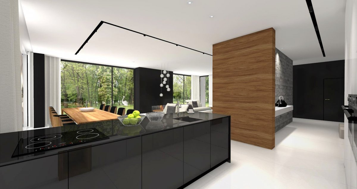 HomeKoncept 30 is a large, modern house whose spectacular shape hides a very functional interior. A unique pergola of white beams surrounds the house, giving it a unique character. The composition of colors and facade materials as well as dark window and door woodwork completes the whole.