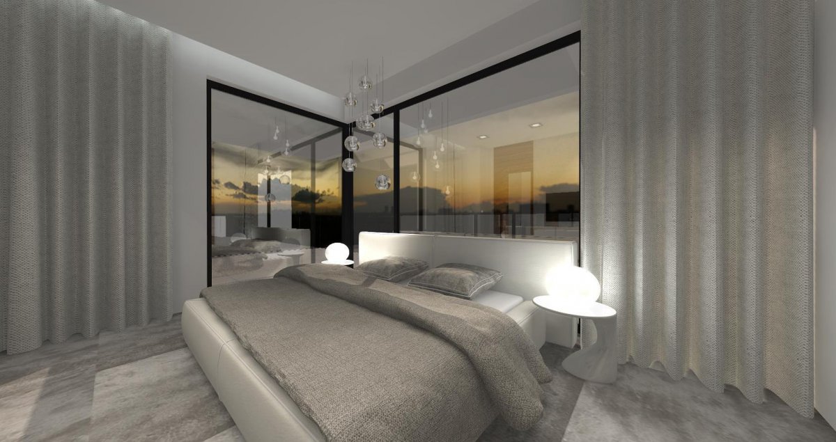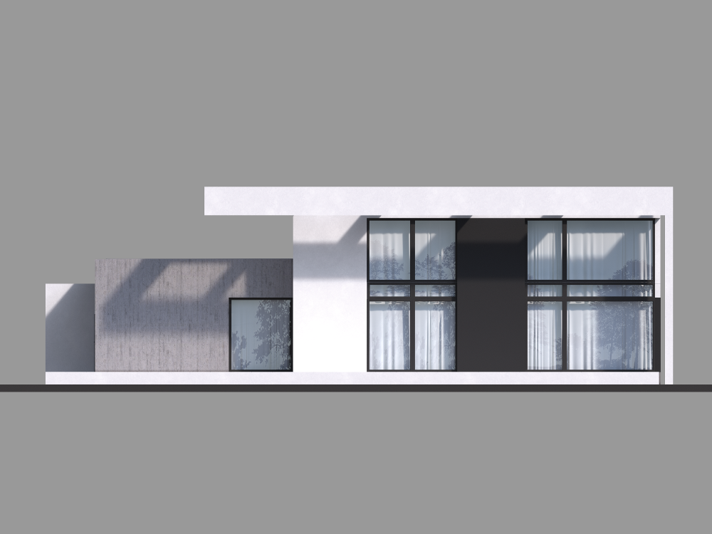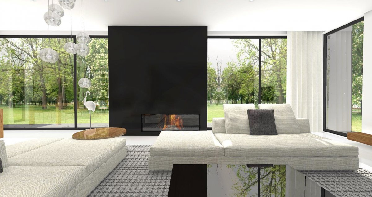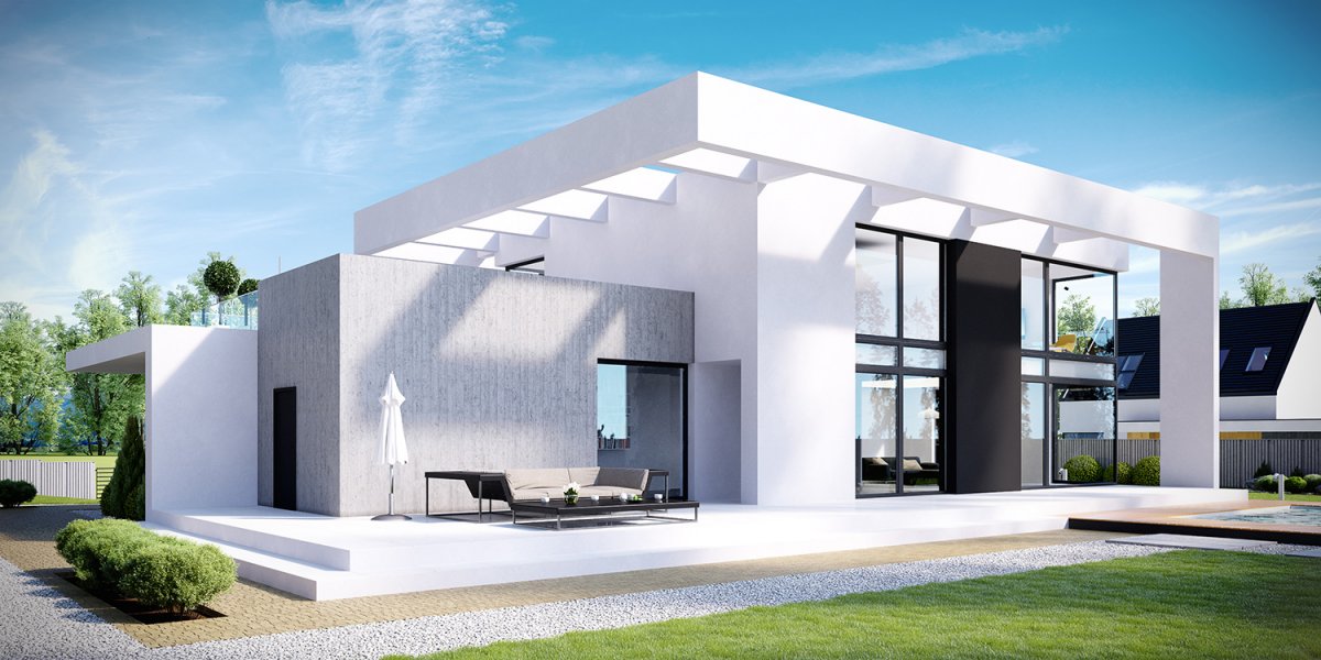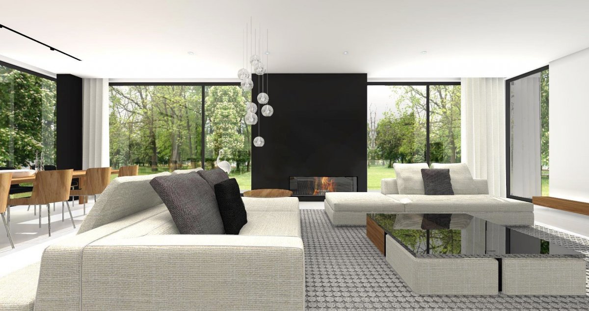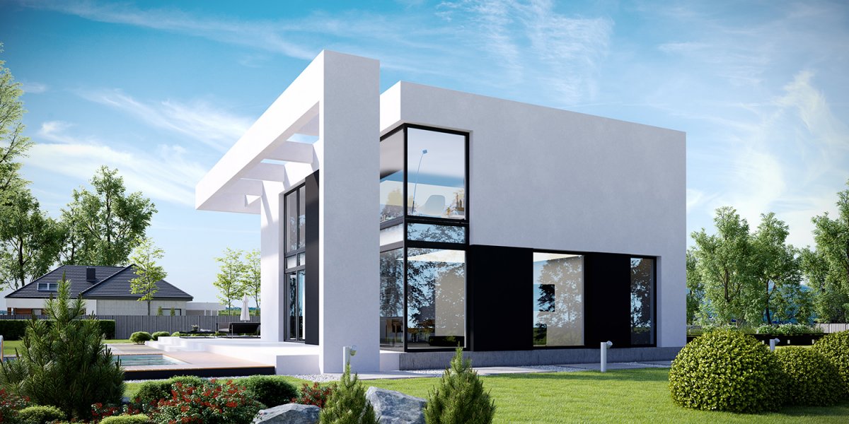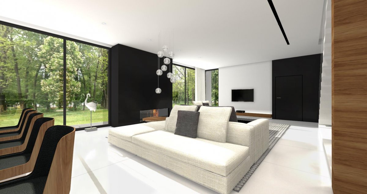 Undoubtedly, the element that distinguishes this design is the unique, two-storey glazing and corner window in the living room. The huge terrace, decorated with a white pergola, will be an ideal place to relax for the whole family.