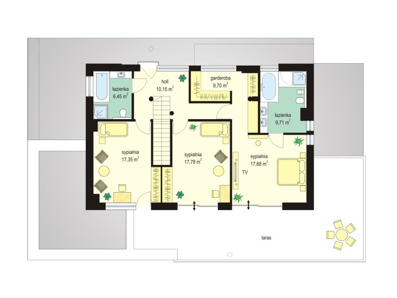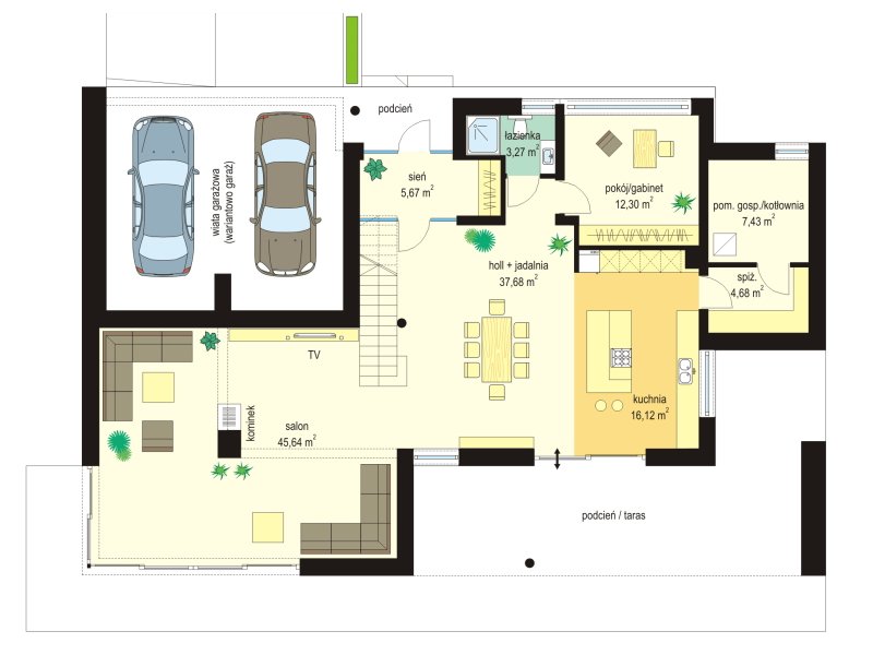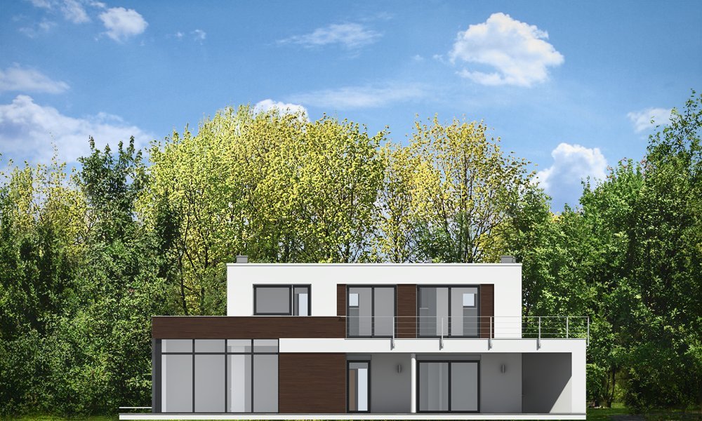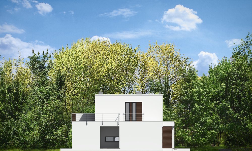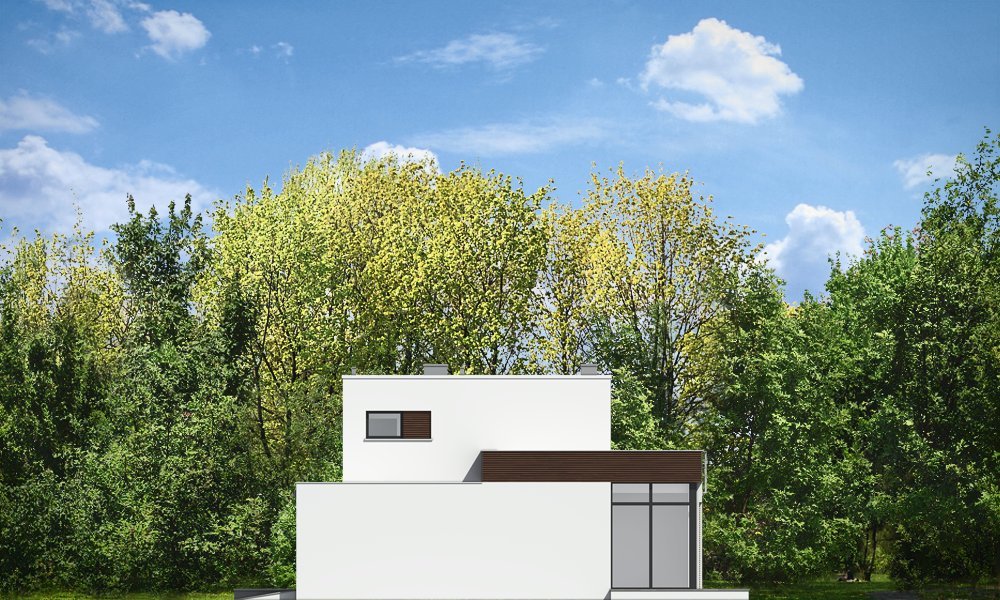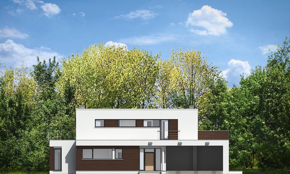Villa l ‘Azur is an elegant, multi-story single-family house with a flat roof, intended for a family of four to five. The building consists of a main, one-story block, surrounded by one-story buildings, roofs and terraces. Architecturally, the house refers to modernist 20th-century villas with flat roofs – in modern terms, using modern materials and solutions. The house is at the same time interesting and intriguing, at the same time subdued and restrained in expression. Interlocking two-story and one-story cuboids of solids, front and garden massive roofing, large, glazing interior – all this creates a unique whole. Contrasting surfaces of white walls, in combination with wooden cladding, windows and chiaroscuro create a very “sculptural” form of the building. The house has been designed in two variants – with a carport at the front or with a closed garage – to choose from. The interior of the villa is classically divided into living part on the ground floor and bedrooms upstairs. From the large glass vestibule we go to the central hall – dining room, connected to the open kitchen with the island, and a beautiful living room with a centrally set three-sided fireplace. The living room in the house has a ceiling raised to one and a half stories high, and a beautiful glass opening to the garden. The living room has two sets of lounge furniture. The kitchen is connected to the economic base of the house – with a boiler room and pantry. An additional room has been designed on the ground floor – e.g. study room, bathroom and garage shelter or a closed garage. On the first floor there are three bedrooms, including parents’ apartment with separate wardrobe and bathroom. From the bedroom you can go out to the beautiful terrace upstairs. The studio also has a mirror image of the design.