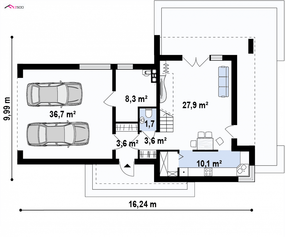 The day zone on the ground floor is a spacious living room with exit to the corner, covered terrace. The wall separating the kitchen can be removed to create a single space interior. The comfort of use is increased by a large pantry. The design provides for a large utility room, toilet and space for capacious wardrobes. A huge advantage is the double garage with direct access to the hall. Above it is a huge terrace accessible from the lobby upstairs. The night zone has three bedrooms and a shared bathroom. The lobby is lit by large balcony windows.
