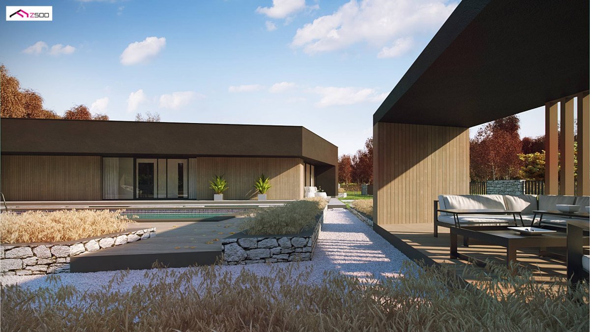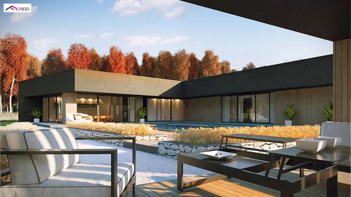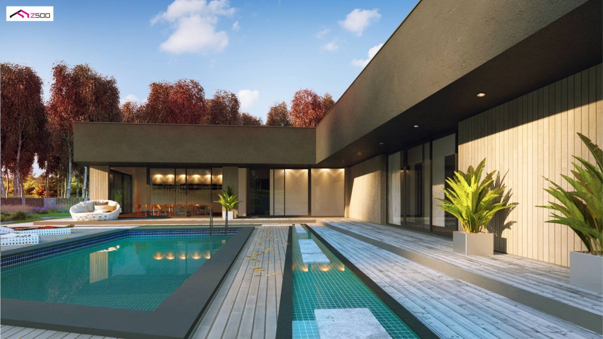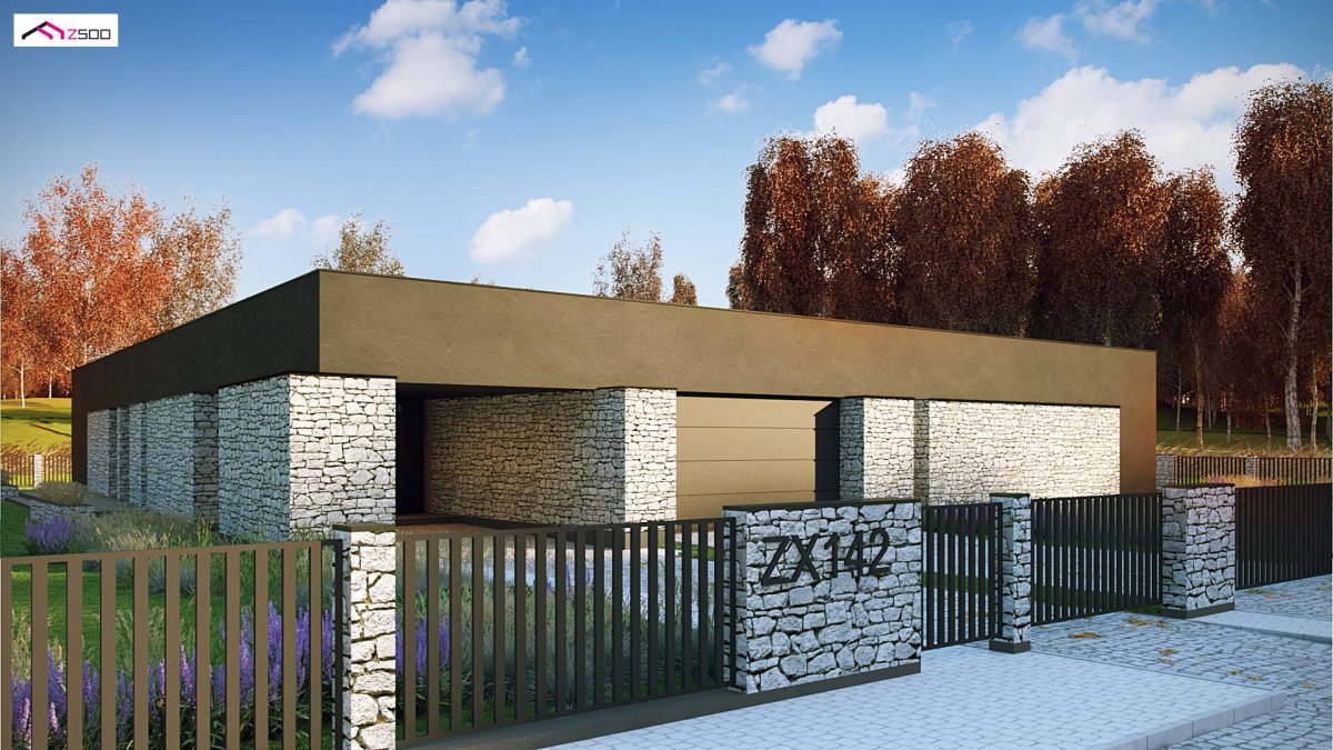 Zx142 is a one-story proposal of a modern house in the shape of the letter “L”, with a flat roof, large glazed windows and three parking spaces.