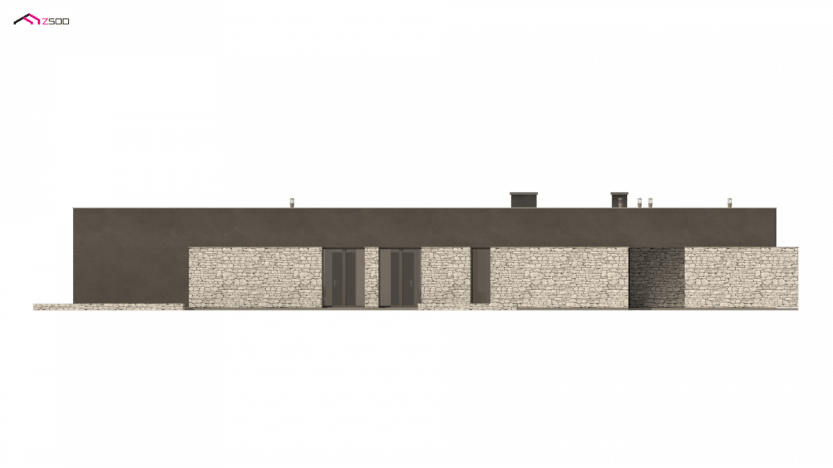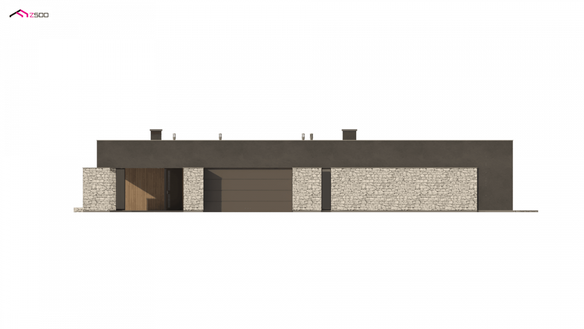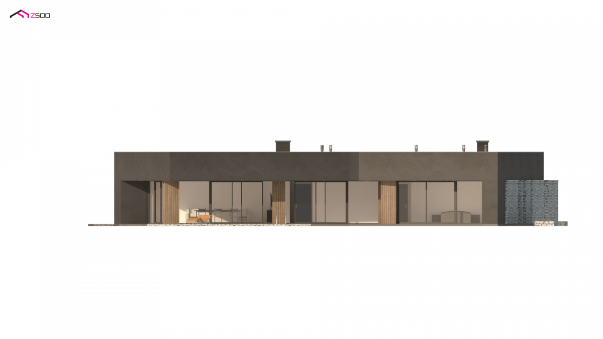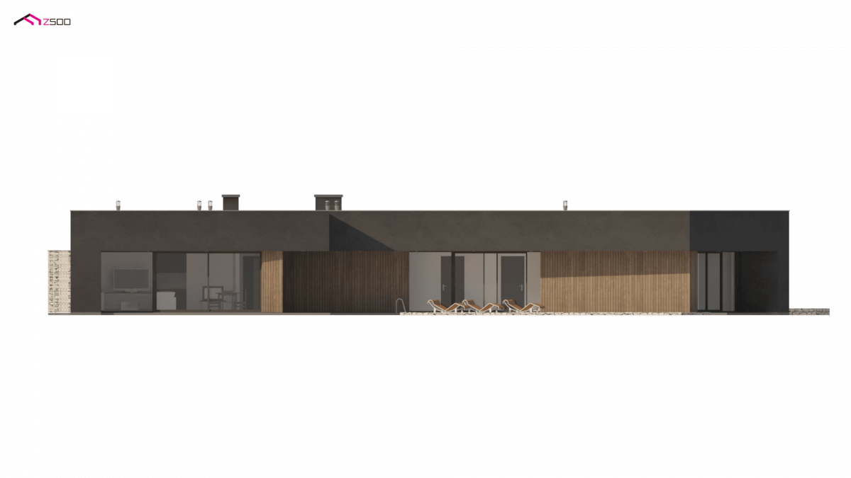 Zx142 is a one-story proposal of a modern house in the shape of the letter “L”, with a flat roof, large glazed windows and three parking spaces.