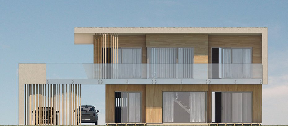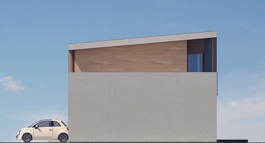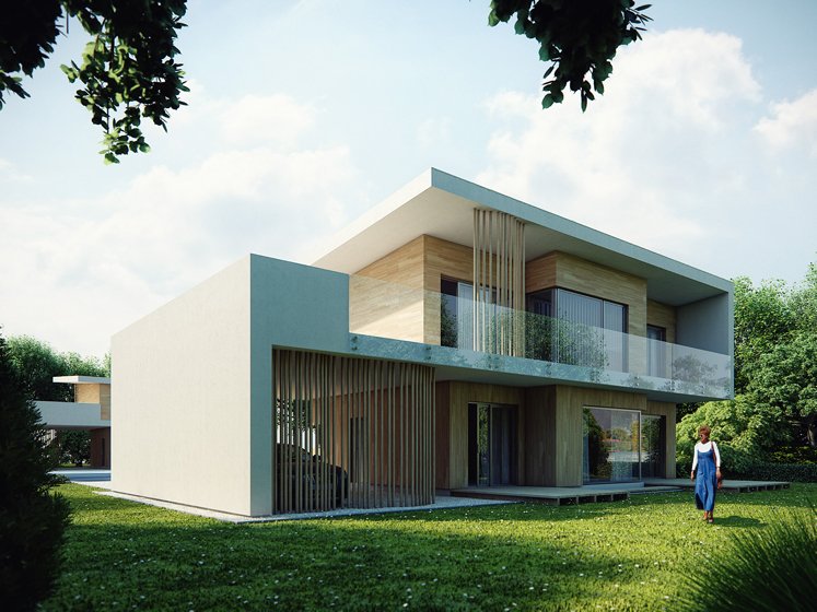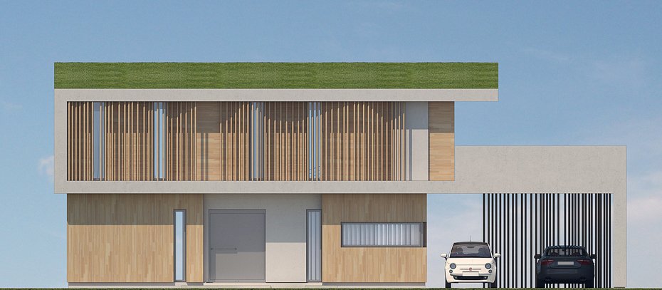 The body of the building is designed on a rectangular plan with a fragmented garden facade and large glazing in the living room and dining room.