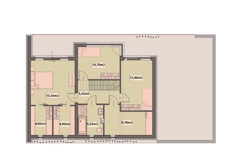 The functional layout of the building has an entrance zone with a boiler room and toilet, a day zone with a semi-open kitchen connected to the dining room, a living room and a small living room with a fireplace connected to the staircase. On the first floor there is a private part, which consists of a bedroom with two wardrobes, two bedrooms, bathroom and laundry.