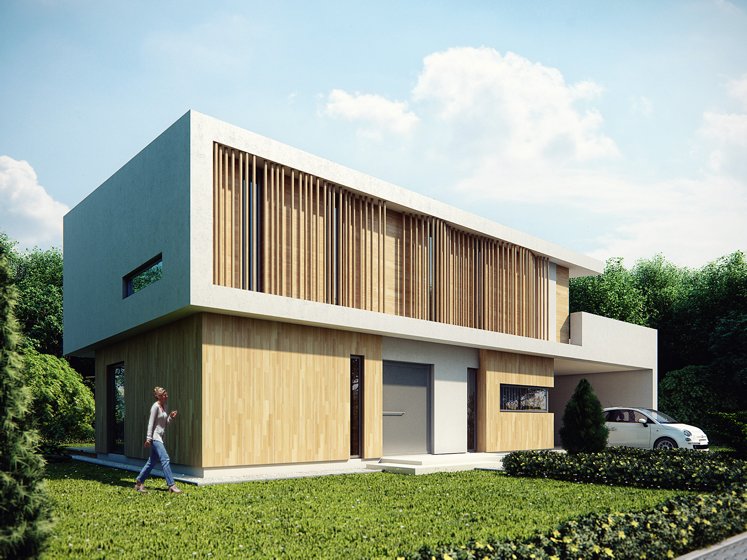 A two-story house with a modern shape for a family of 4.