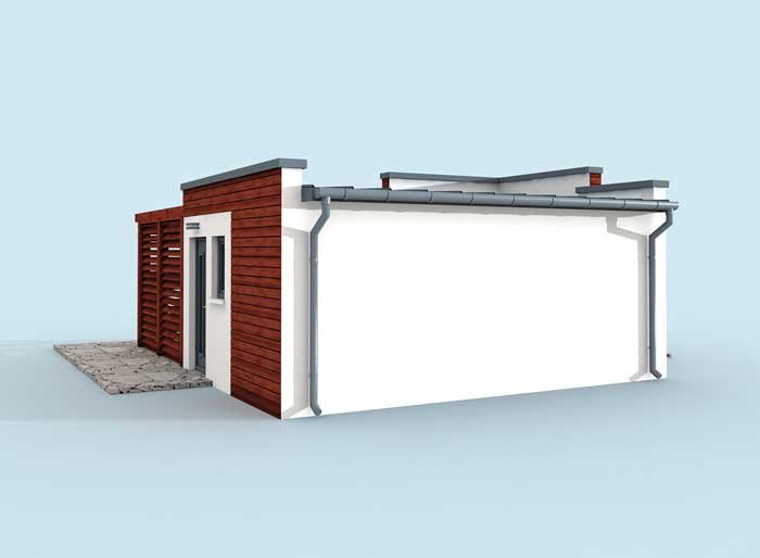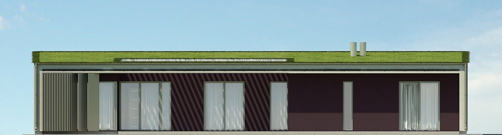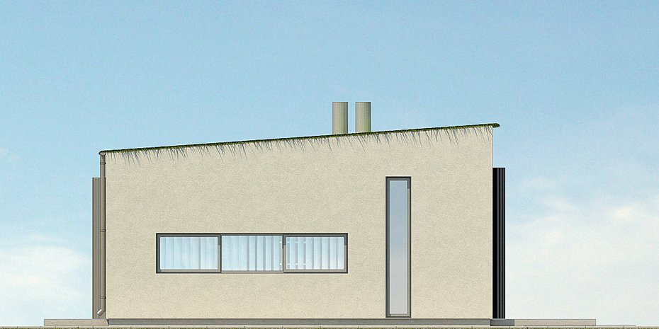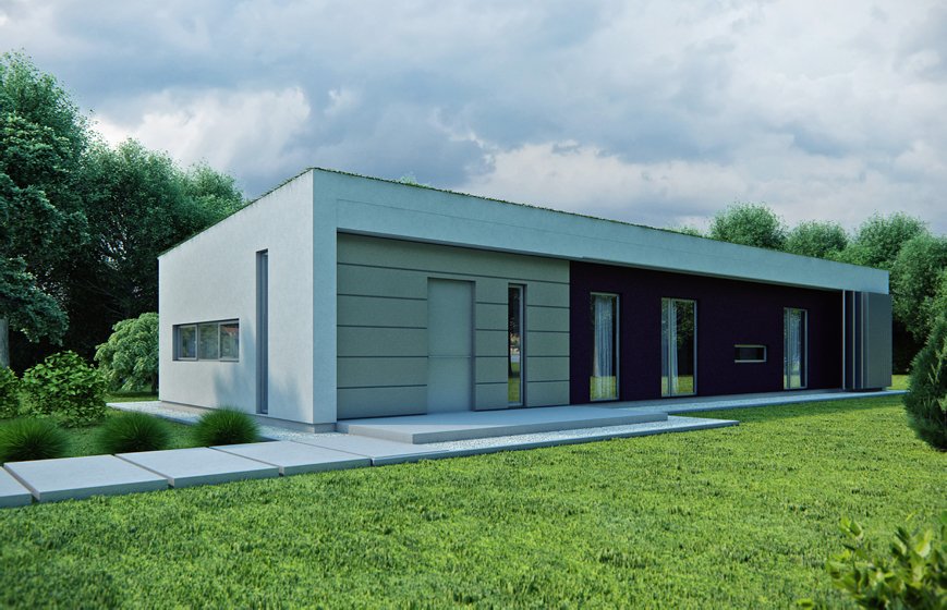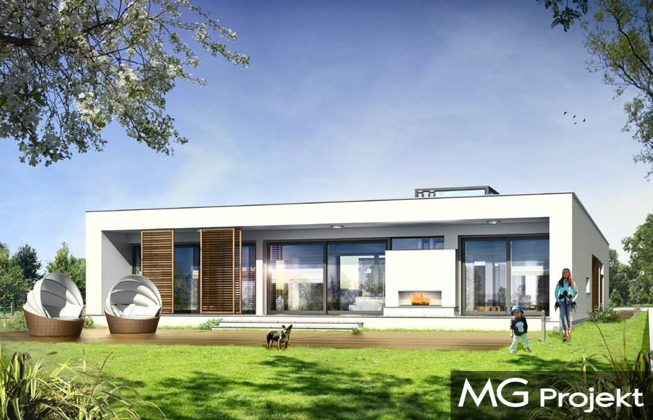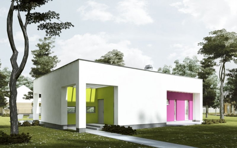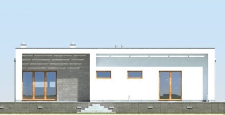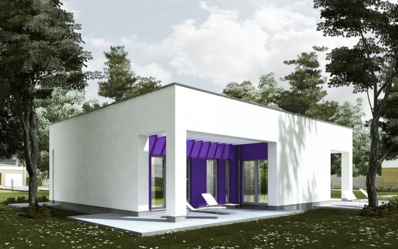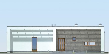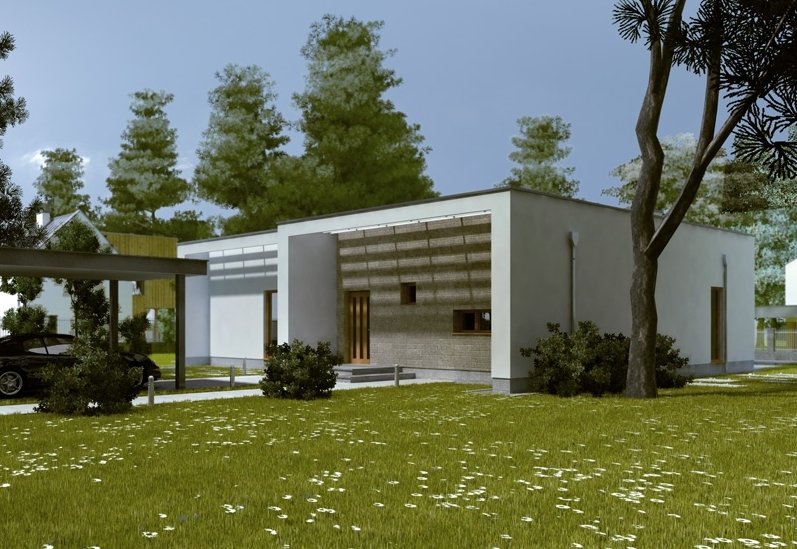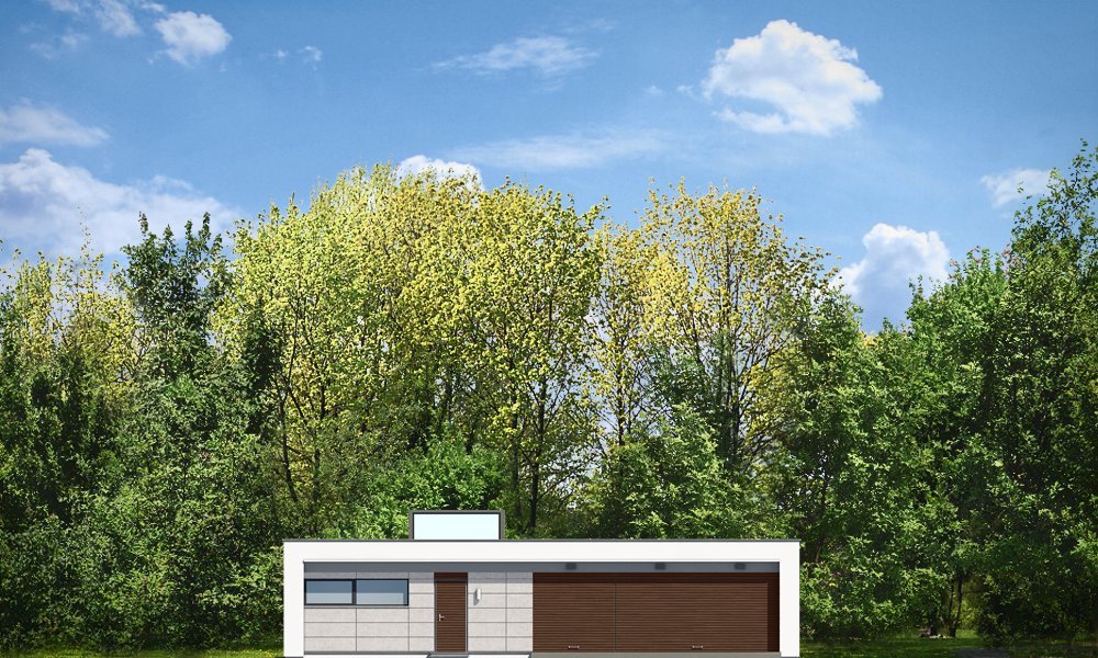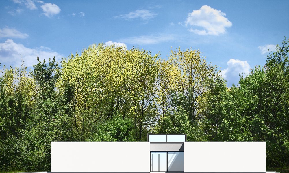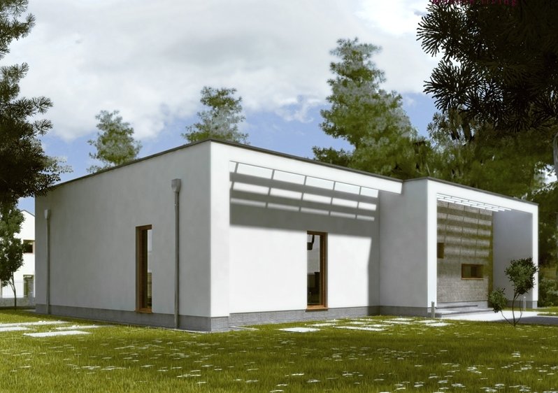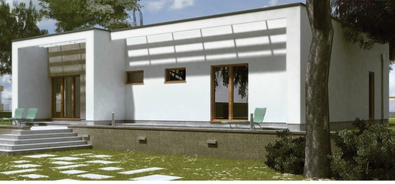 Zx35 is a modern one-story house with a flat roof. It owes its innovative character to a simple block, roof slopes hidden behind the attic and large glazing in the living room. White plastered facade and wooden cladding are a great complement to the modern style.