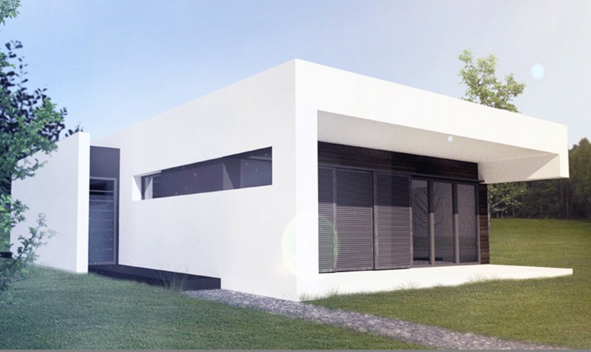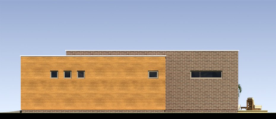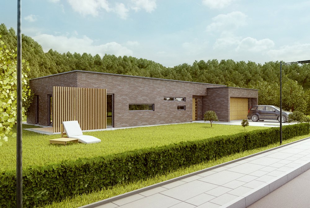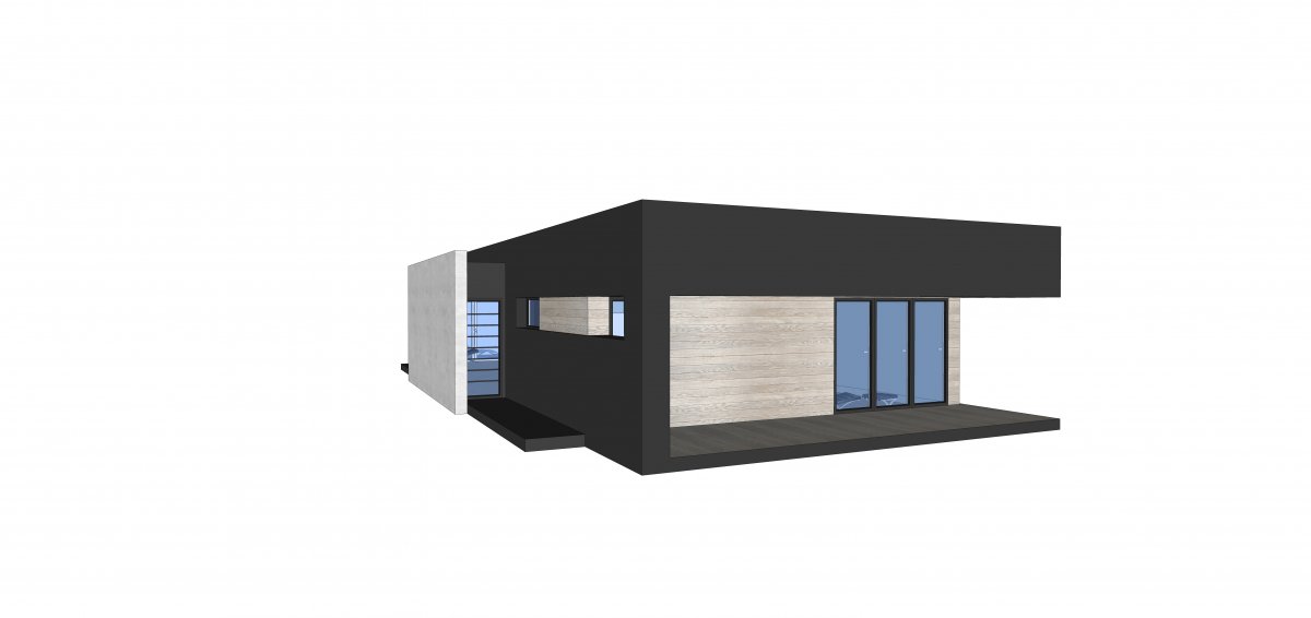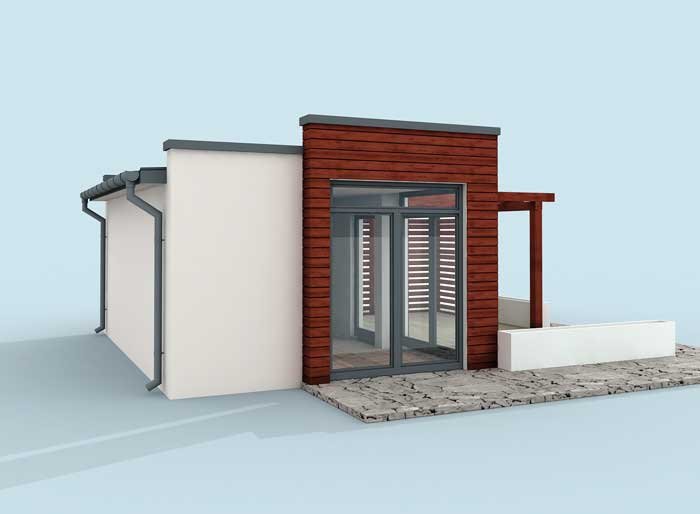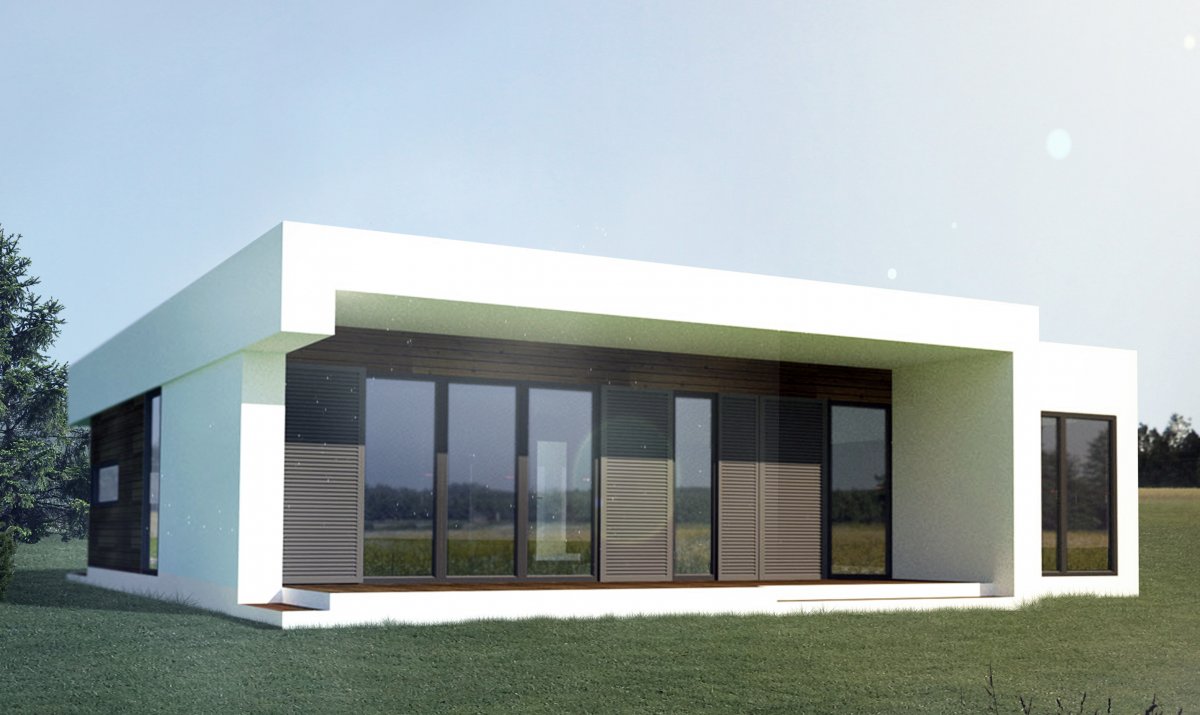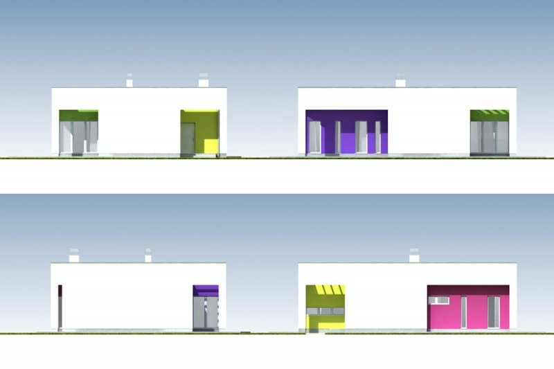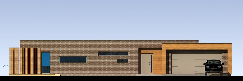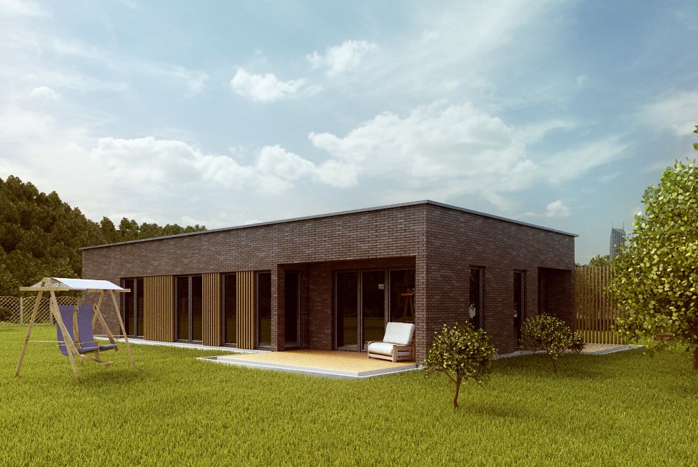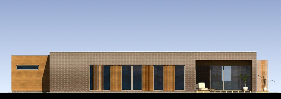 Zx35 is a modern one-story house with a flat roof. It owes its innovative character to a simple block, roof slopes hidden behind the attic and large glazing in the living room. White plastered facade and wooden cladding are a great complement to the modern style.