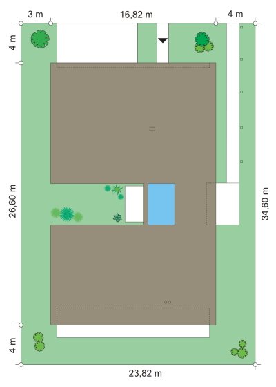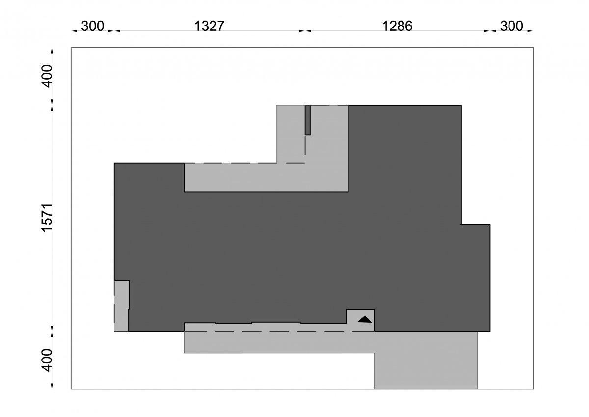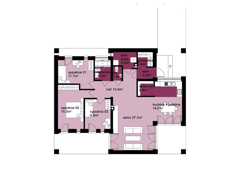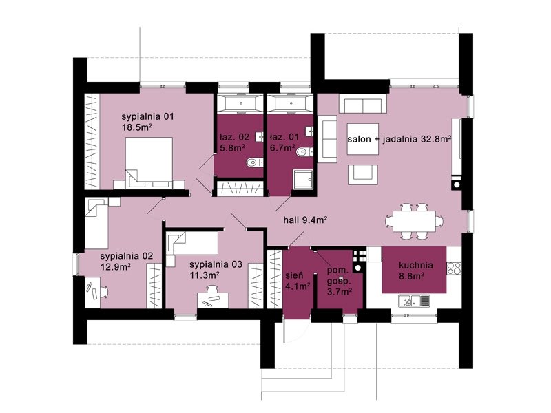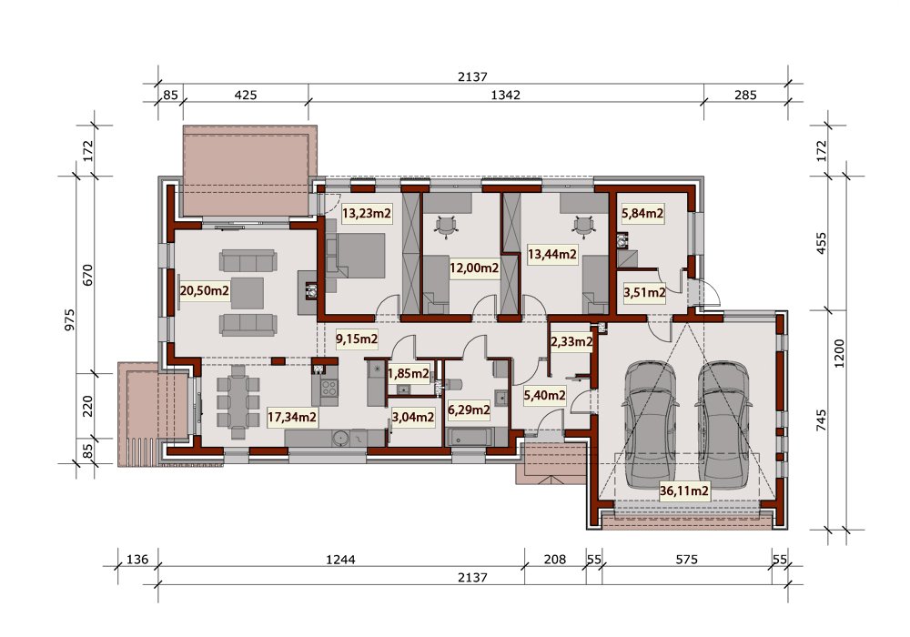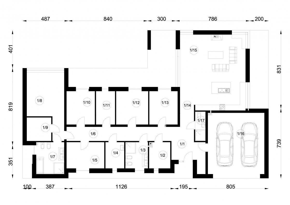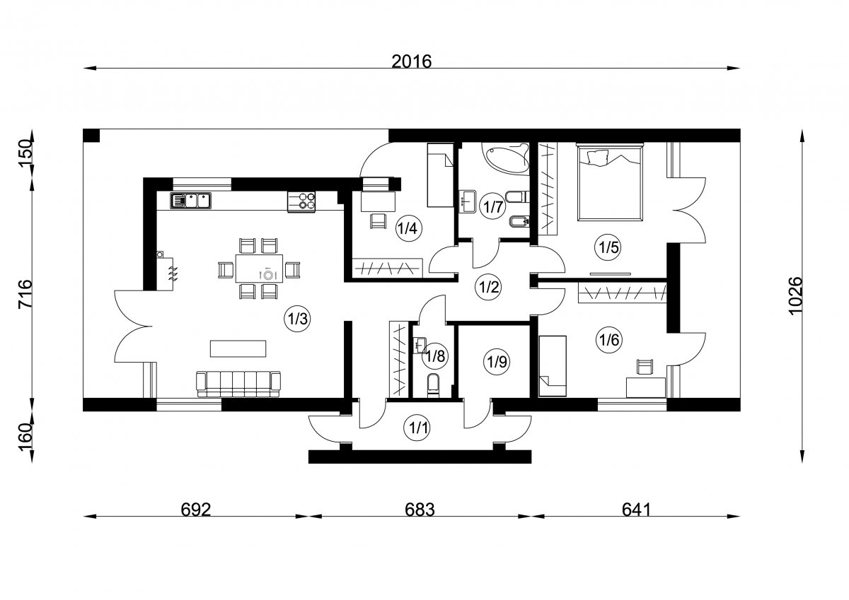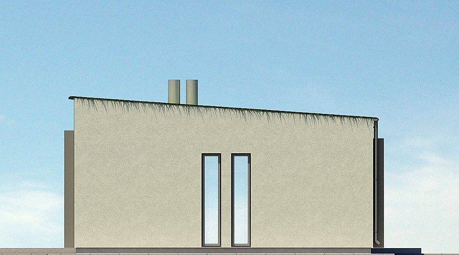 The rest of the house is three comfortable bedrooms, which can be separated from the living area, e.g. by folding doors. The largest of them has its own bathroom, illuminated with two windows, with a shower. A large wardrobe in the hall will certainly accommodate the most necessary things and lumber. A compact house can be adapted as low-energy.