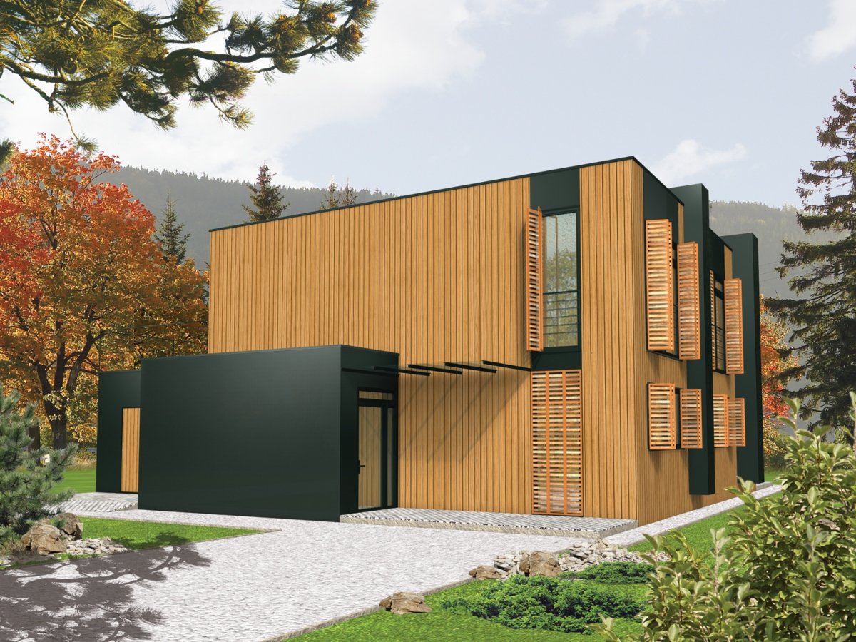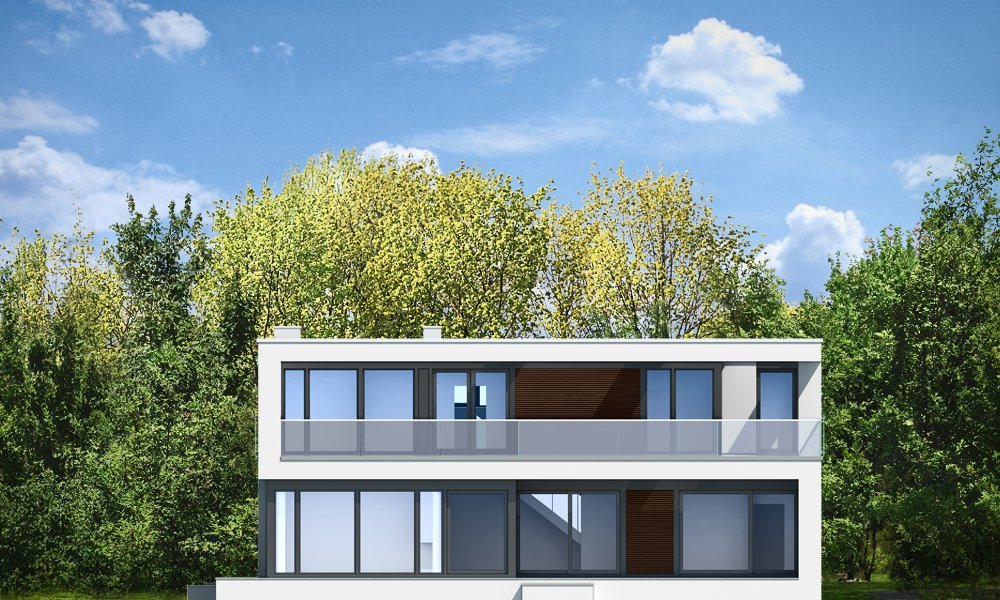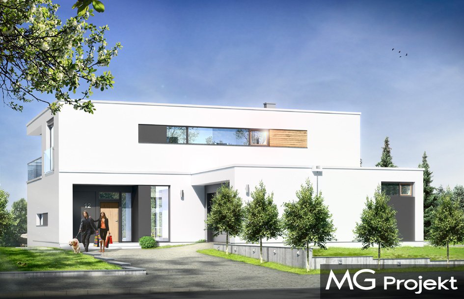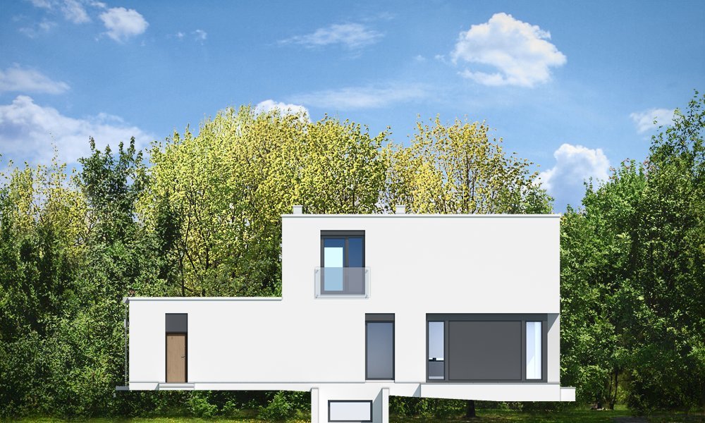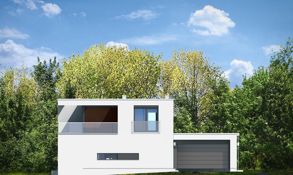 “RON” is a small, comfortable, multi-story house with a characteristic, modern architecture. On the ground floor there is a vestibule, hall, open kitchen with island, spacious dining room lit by bay windows, comfortable living room with a covered terrace, bathroom and utility room with boiler room. A roofed parking space for the car was located at the front. On the first floor there are three large bedrooms, including two with their own wardrobes, a comfortable public bathroom and communication with a partially open space above the living room. The largest bedroom at the front has its own large terrace. The house has been designed with an emphasis on functionality, reduction of implementation and operation costs due to increased energy-saving parameters.