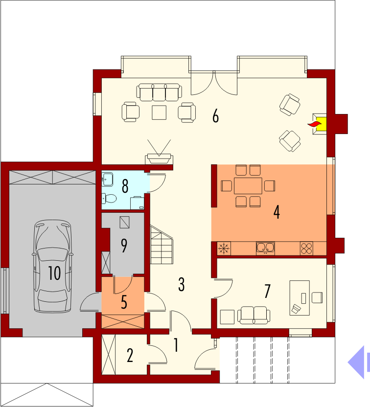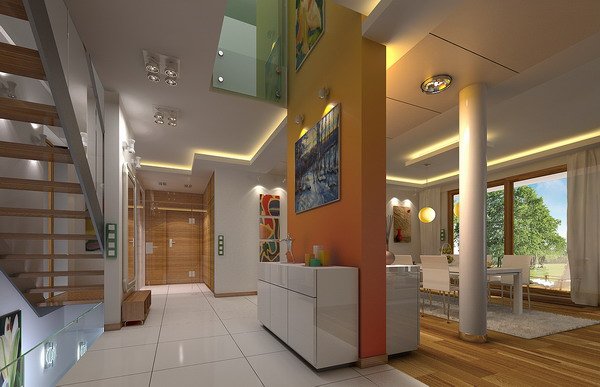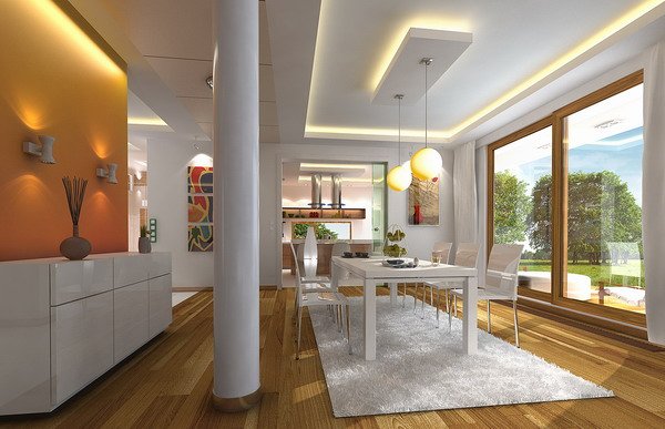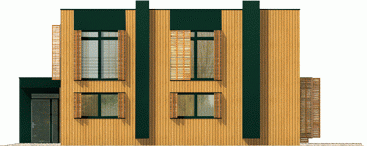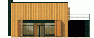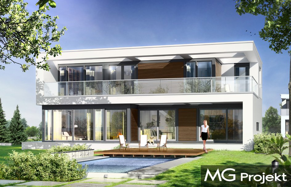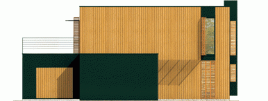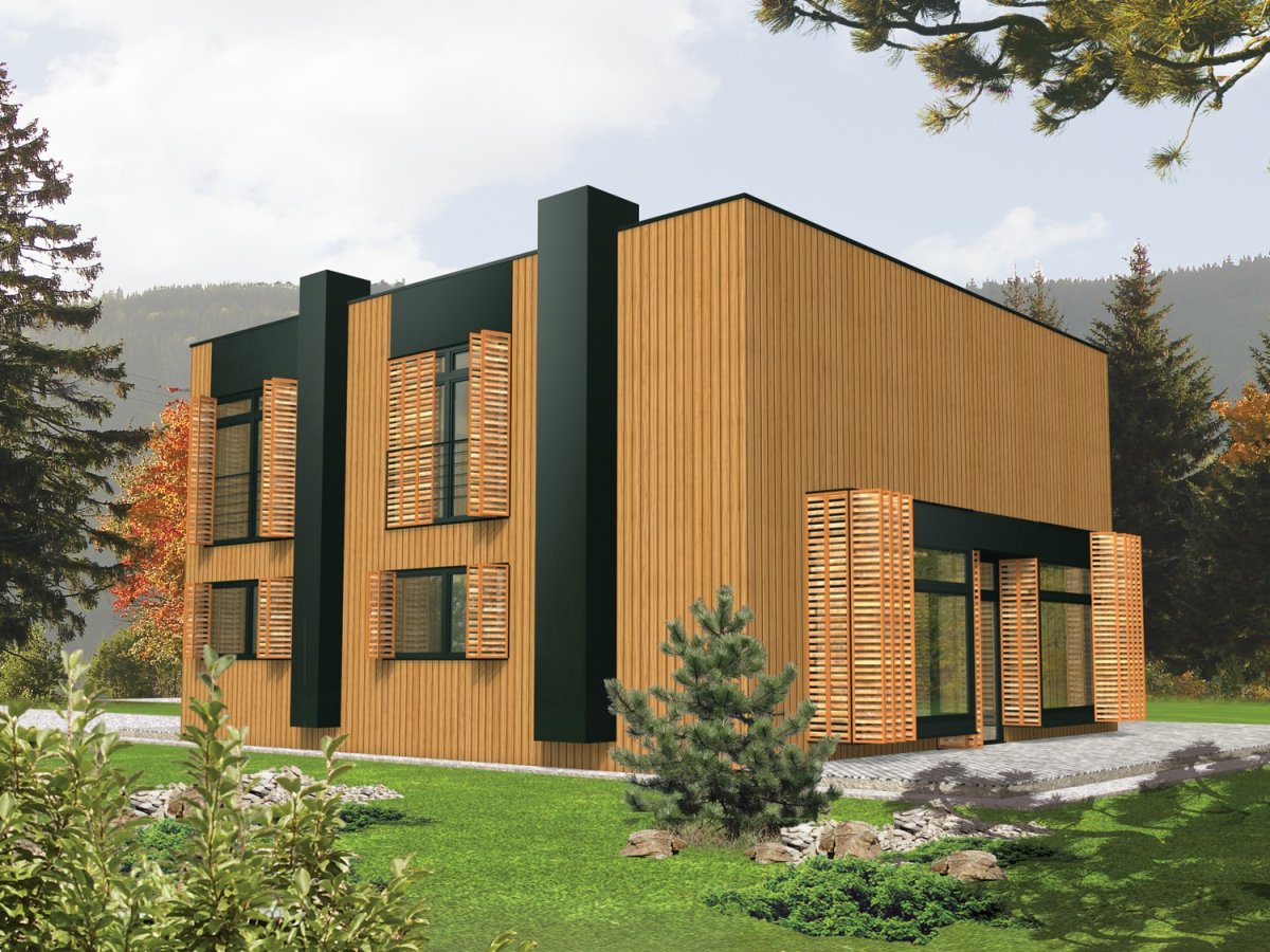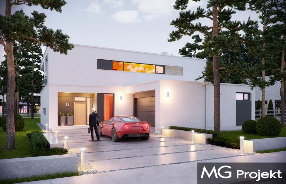 “RON” is a small, comfortable, multi-story house with a characteristic, modern architecture. On the ground floor there is a vestibule, hall, open kitchen with island, spacious dining room lit by bay windows, comfortable living room with a covered terrace, bathroom and utility room with boiler room. A roofed parking space for the car was located at the front. On the first floor there are three large bedrooms, including two with their own wardrobes, a comfortable public bathroom and communication with a partially open space above the living room. The largest bedroom at the front has its own large terrace. The house has been designed with an emphasis on functionality, reduction of implementation and operation costs due to increased energy-saving parameters.