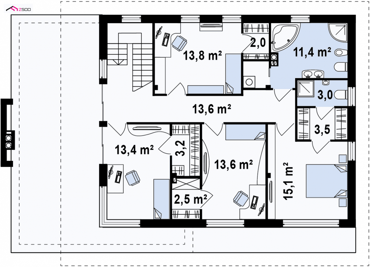 On the ground floor, they also found a place: a double garage, a large utility room with an entrance from the garden, a bathroom, a pantry, a wardrobe and an additional room for e.g. a study. Stairs lead upstairs from the living room. A private zone of household members is planned here : 4 rooms , each with its own wardrobe and a comfortable bathroom with a separate laundry room. The panoramic terrace , which works as an attractive and charming place to rest, is available directly from the lobby.