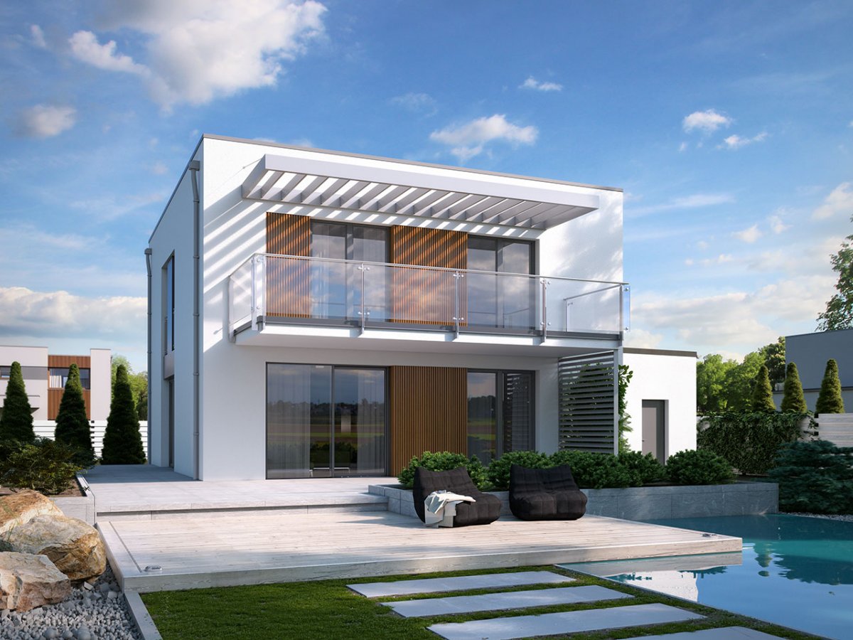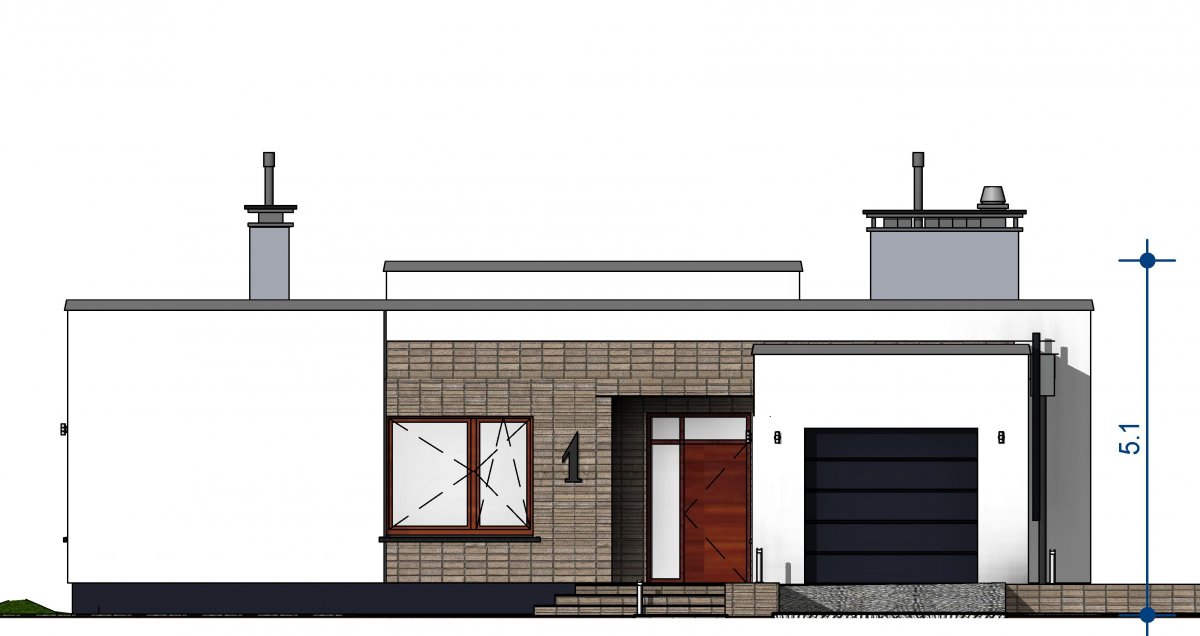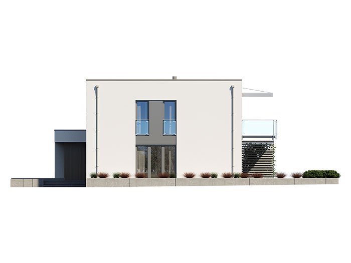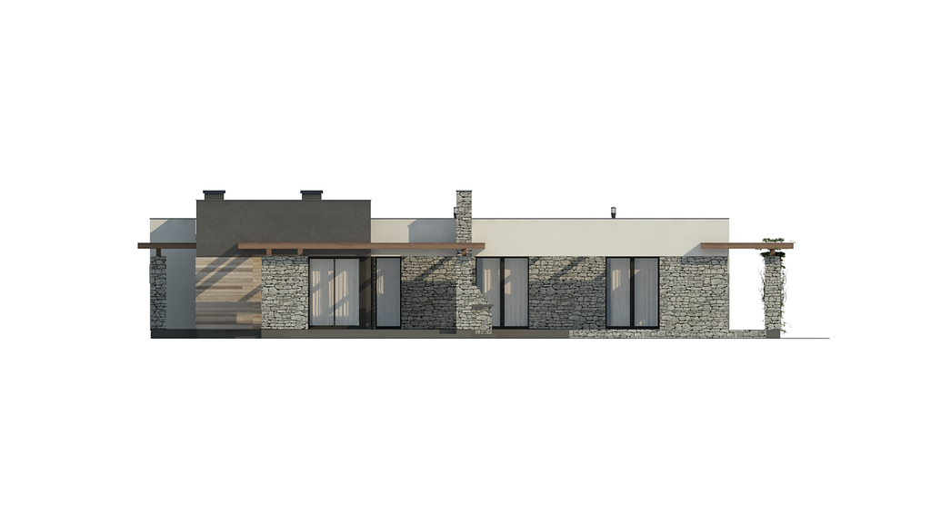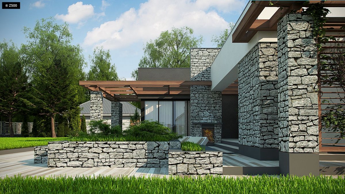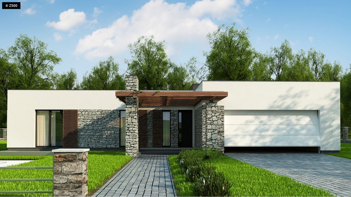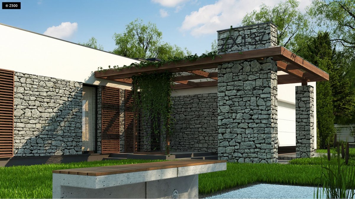 Zx137 is a one-story building with a double garage and a flat roof. It has large glazing and openwork roofing over the entrance and garden part.