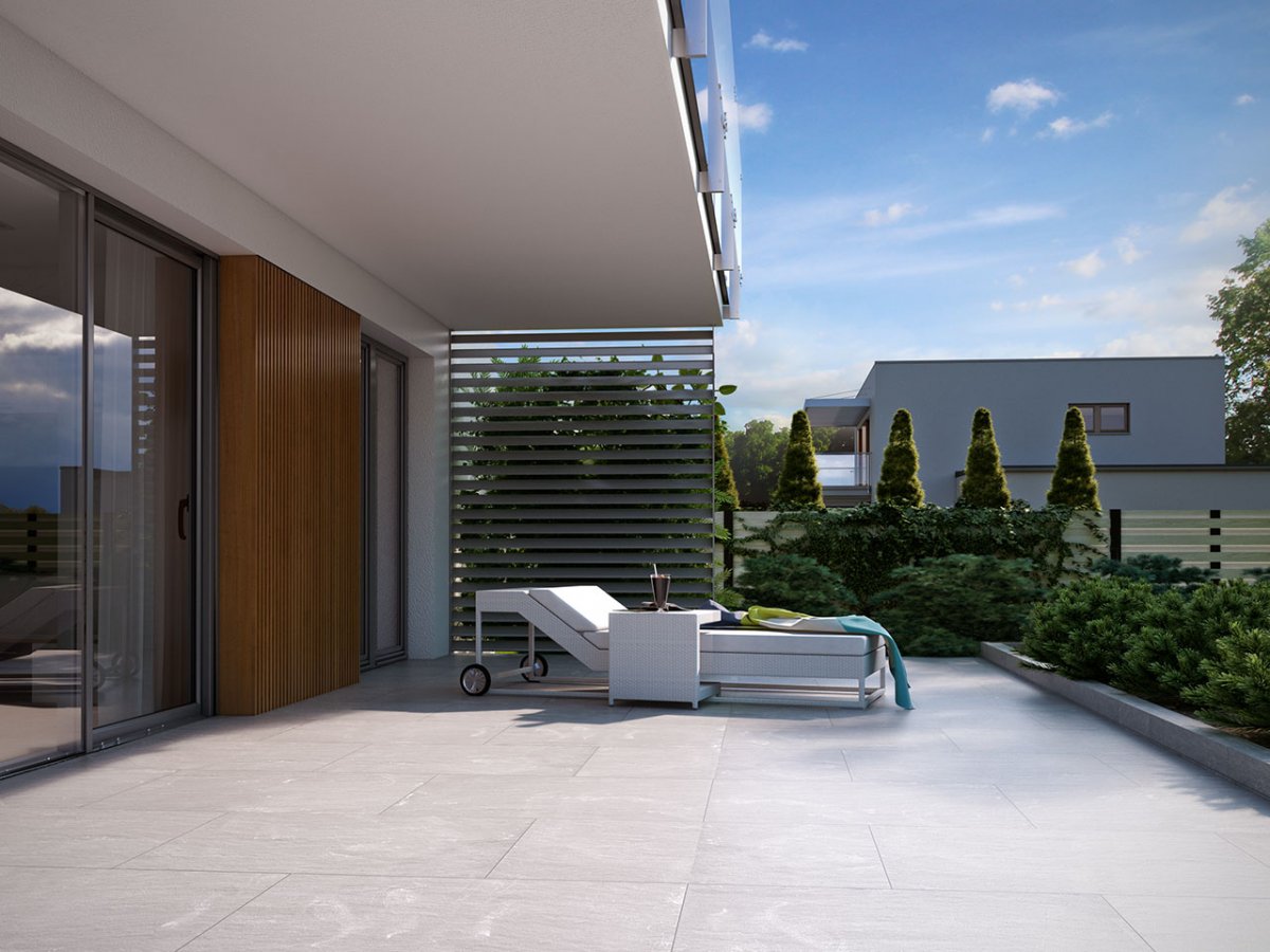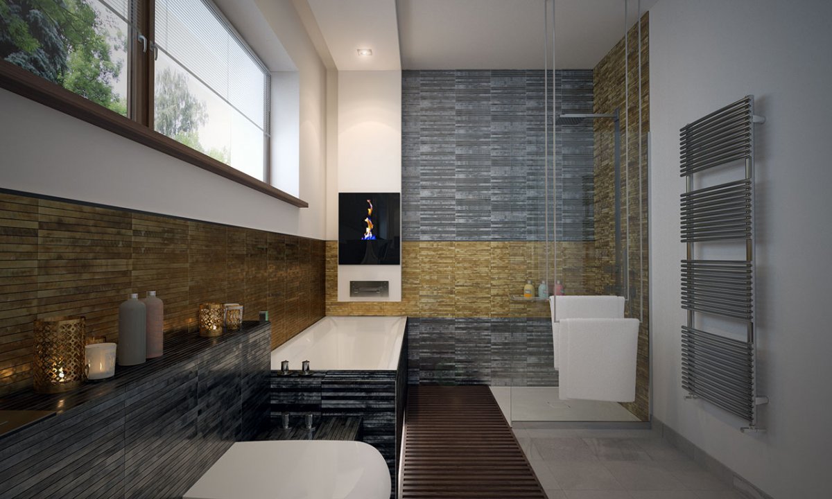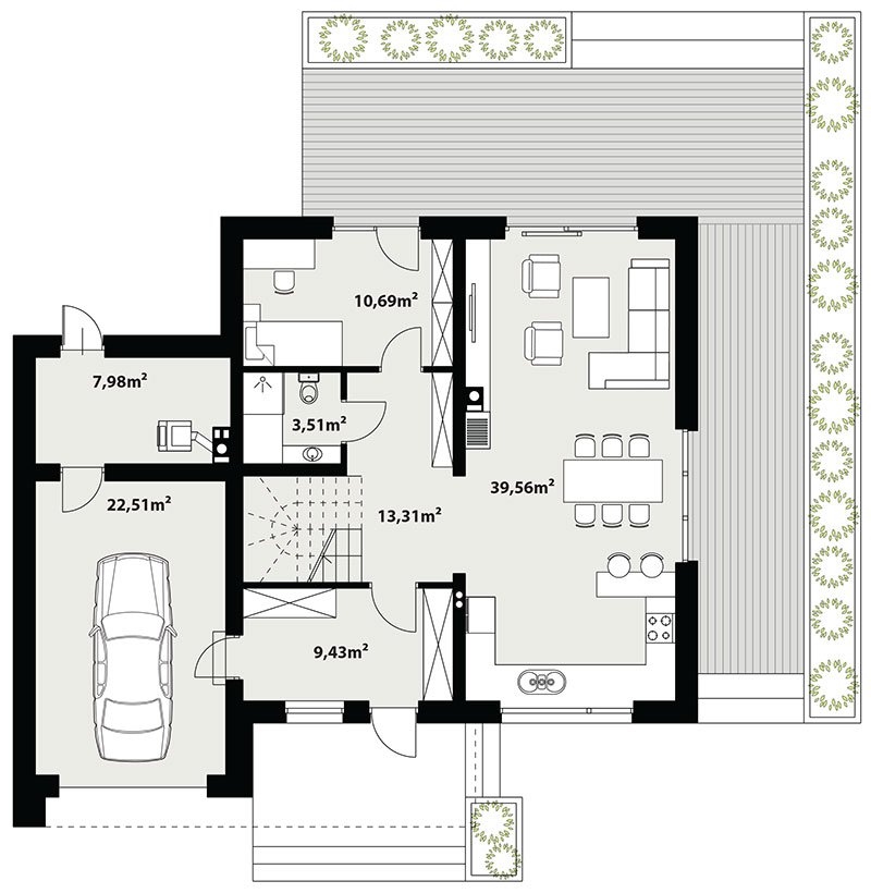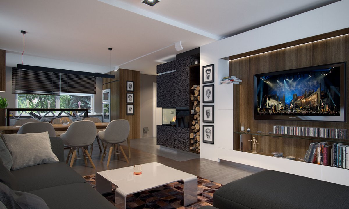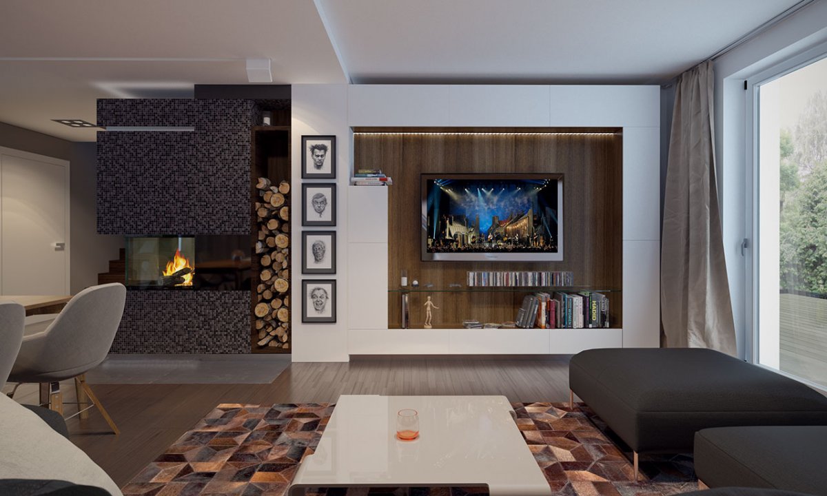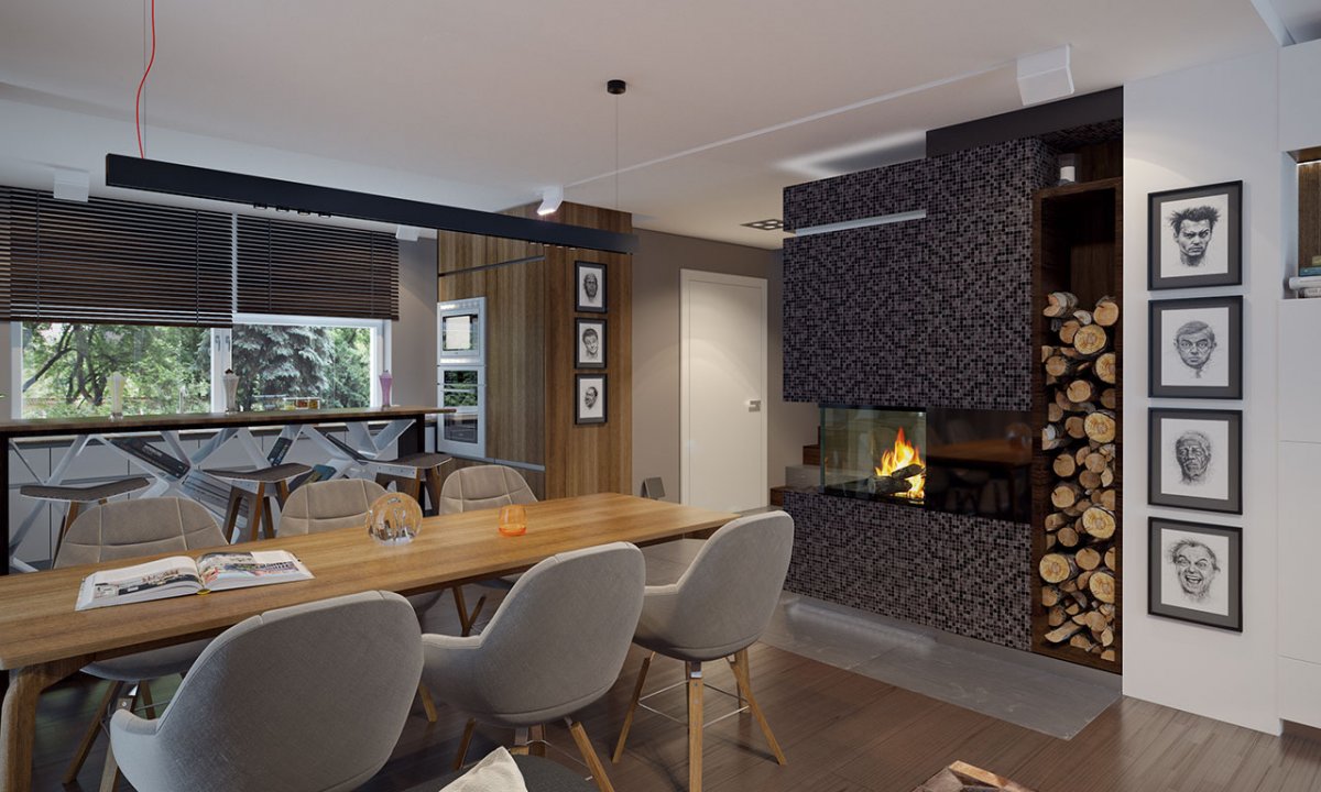 The building has two entrances. The front one, thanks to which the autumn rain will never make itself comfortable in our hall, because the entrance is partly roofed. And the second exit – leading to the terrace with an external fireplace, then to the garden, where in spring the shade of the trees looks into the green fruit, as if in the eyes.