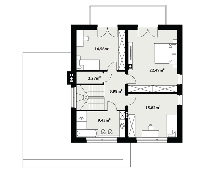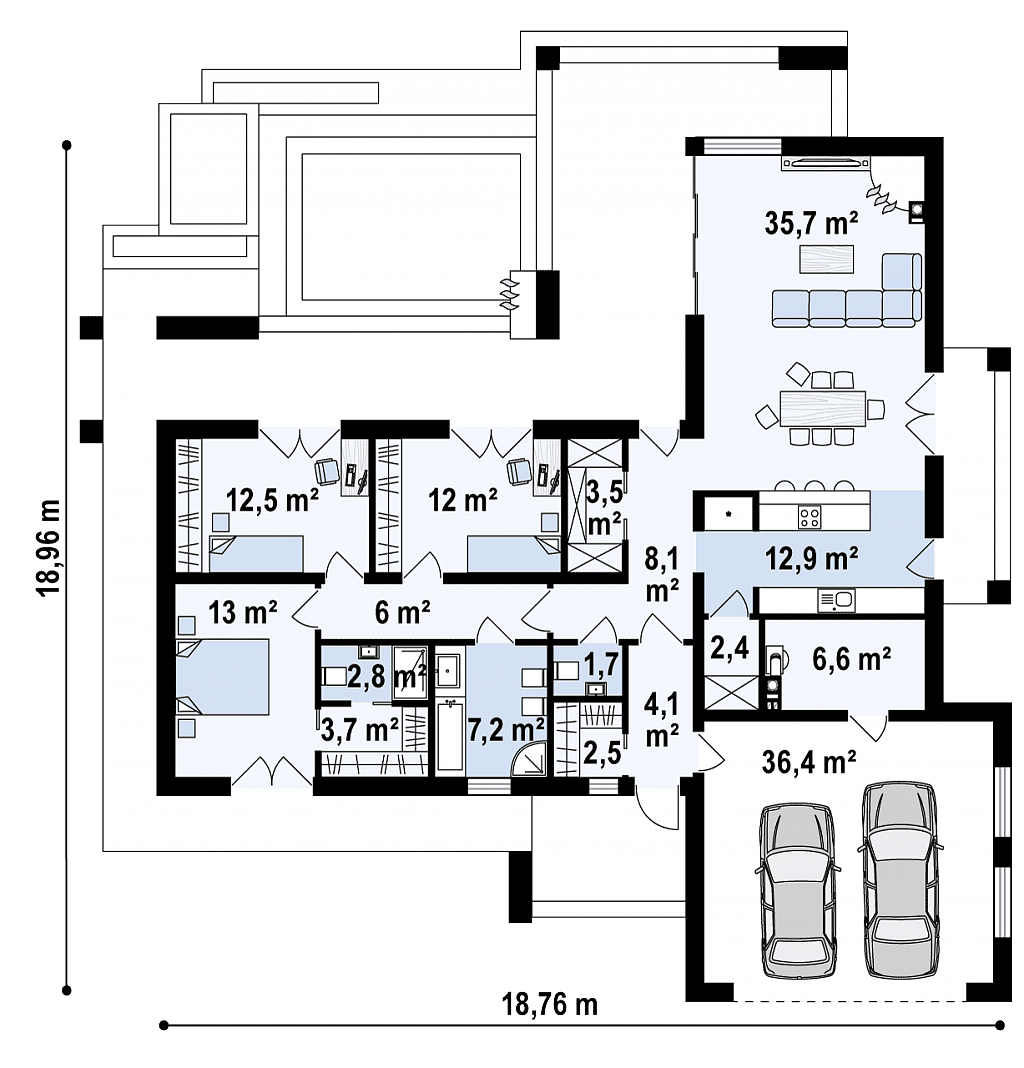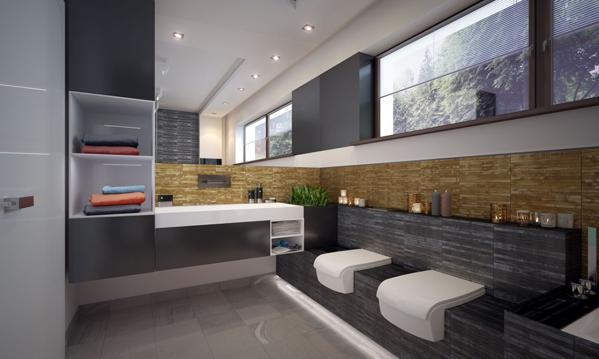In the left part of the house, 3 bedrooms have been designed, including the largest for parents – it has a separate bathroom and wardrobe. The other 2 rooms can be intended for children.