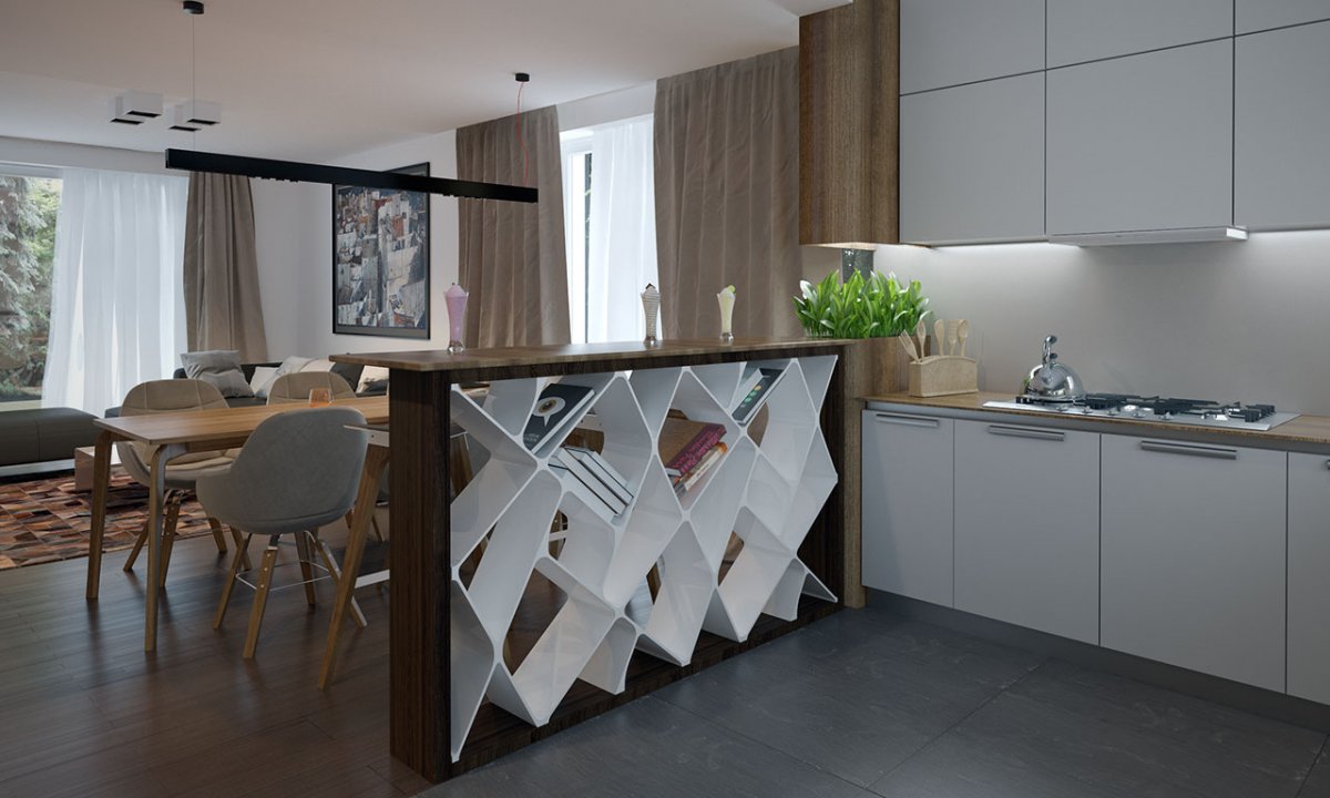 The right part of the house is a day part, the left part is a night one. The kitchen is combined with the dining room and living room on an open space basis. Thanks to this, it is spacious and we can enjoy our representative surface.