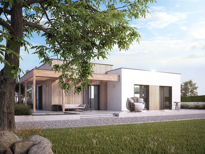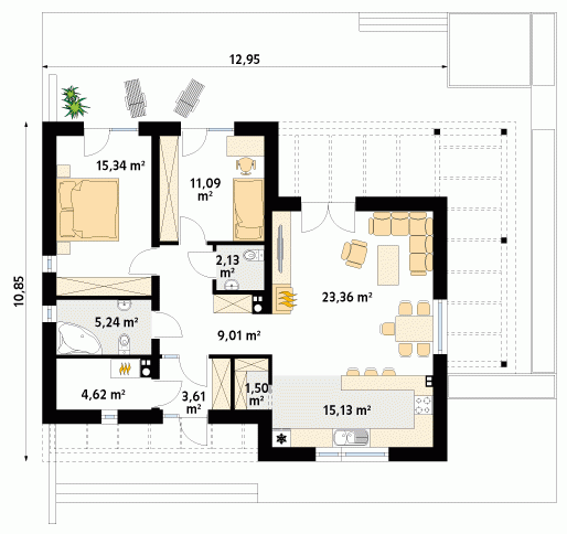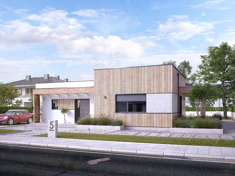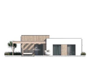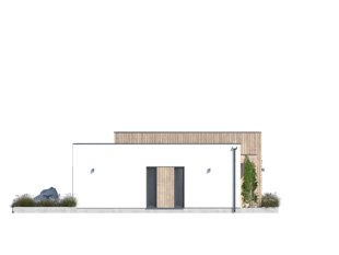 A small, single-family one-story house meeting the needs of a family of three. The optimal layout of the rooms has been divided into day and night zones. The living area has a spacious living room with dining room, kitchen with pantry and a representative hall. In the night part there are two bedrooms and bathrooms.