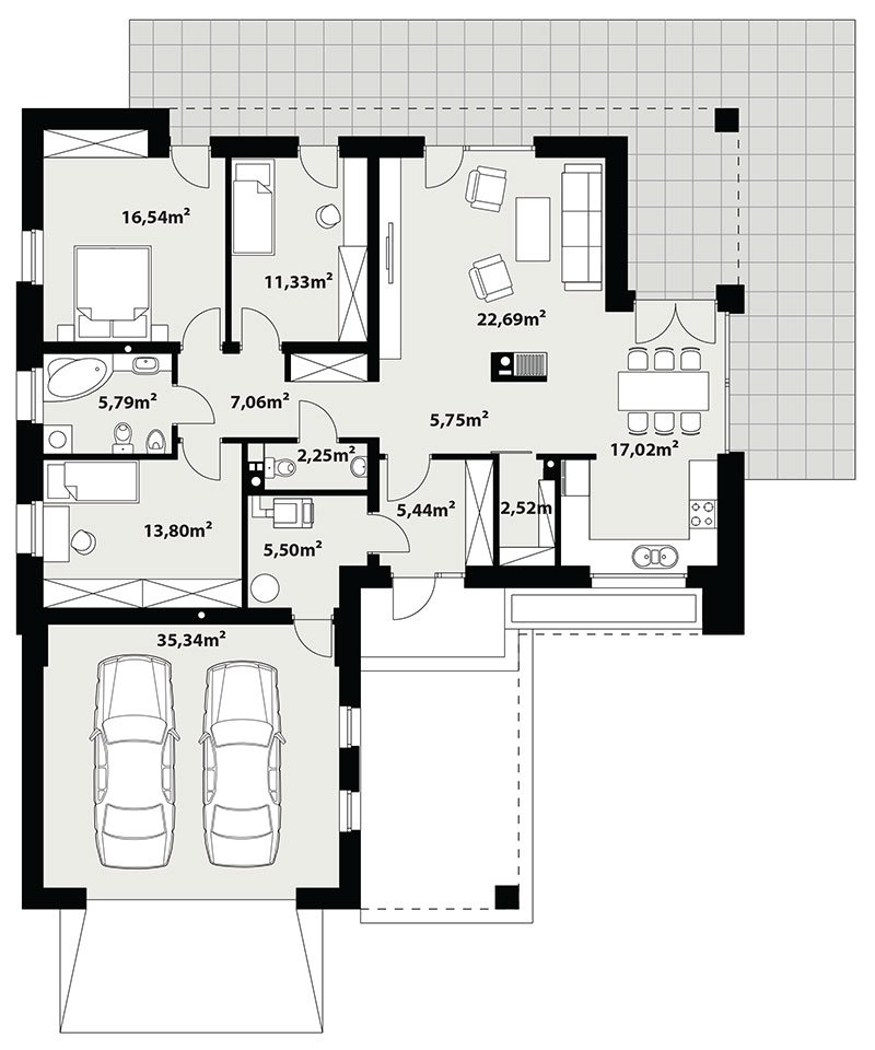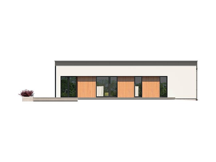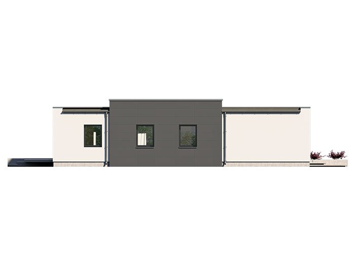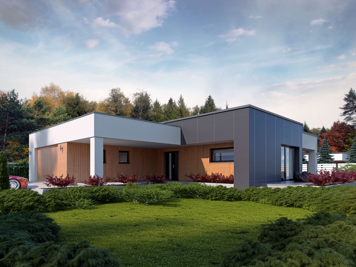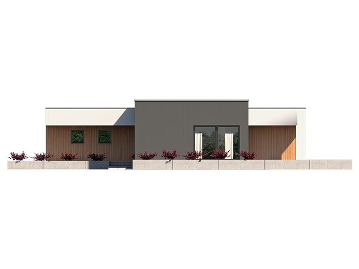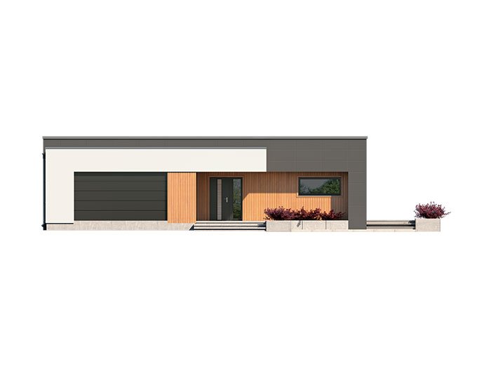 A one-story single-family house with a double garage maintained in the style of a modern villa. It combines the modern nature of the facade with a simple, classic arrangement of rooms. It is a very comfortable, simple and functional house, which with its full program ensures optimal comfort for a family of 4. The spacious living area has a large living room, dining room opening to the garden through huge glazing, kitchen with pantry and toilet.