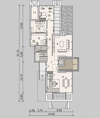 The modern and elegant project LK & 1117 impresses with its original form. An ideal home for people who like spacious and functional interiors in a block with an interesting design. The advantage of the house is the separation of the night zone with three bedrooms, two bathrooms and wardrobes from the living area with living room, dining room, kitchen, study room and sauna.