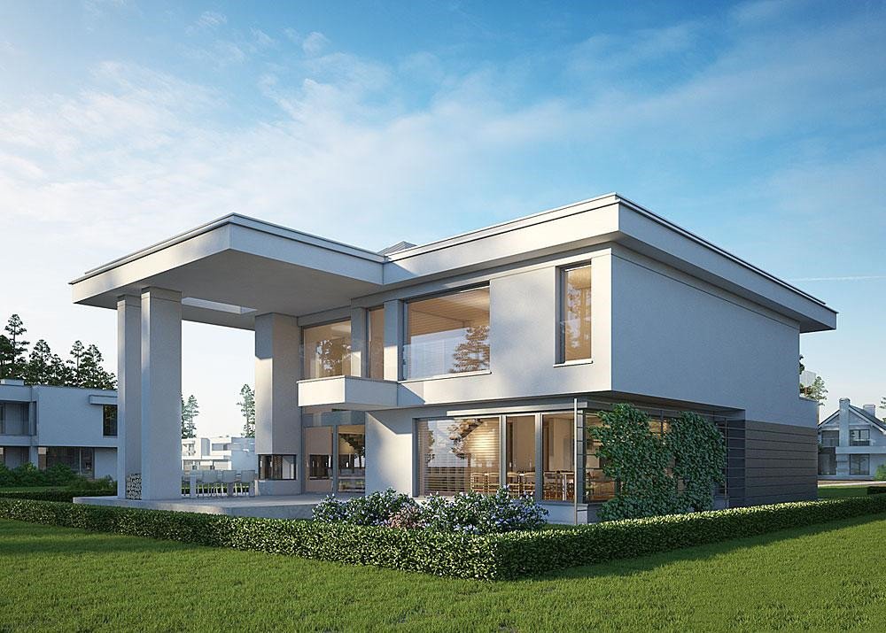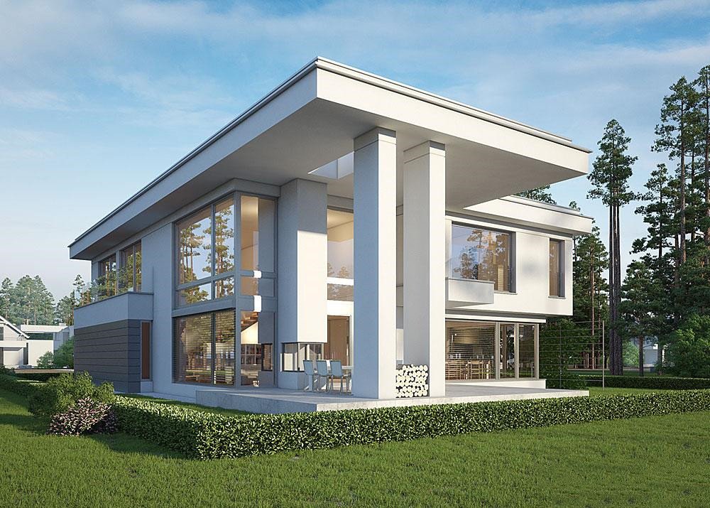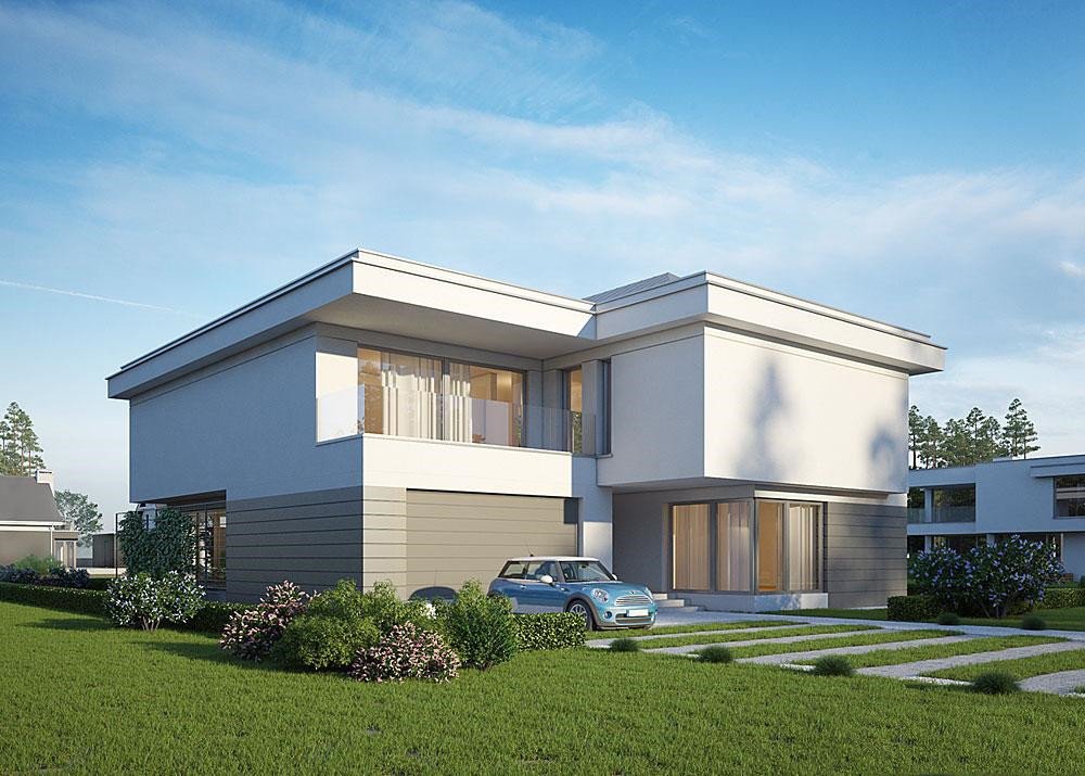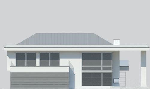 A modern one-story house with a garage, a spacious kitchen connected to the dining room, a living room, three bedrooms and a room for a home cinema.
