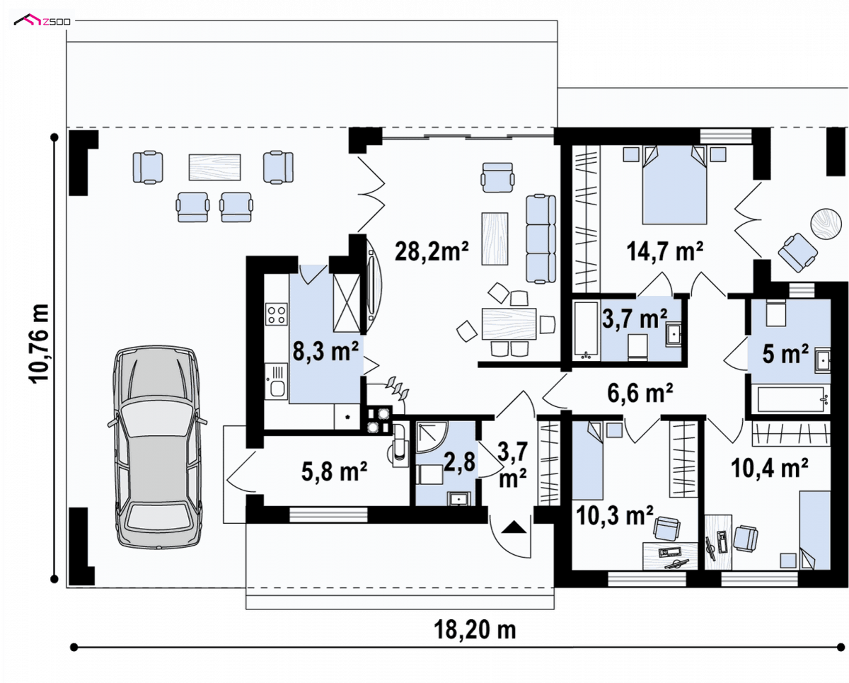 An additional advantage is the fact that the Zx117 design has 3 bathrooms . Thanks to this, it is quite likely that we will forget about the expression: “queue for morning or evening toilet”. However, if we think that 3 bathrooms are too much, then one of them can be transformed into a laundry room, storage room or wardrobe.