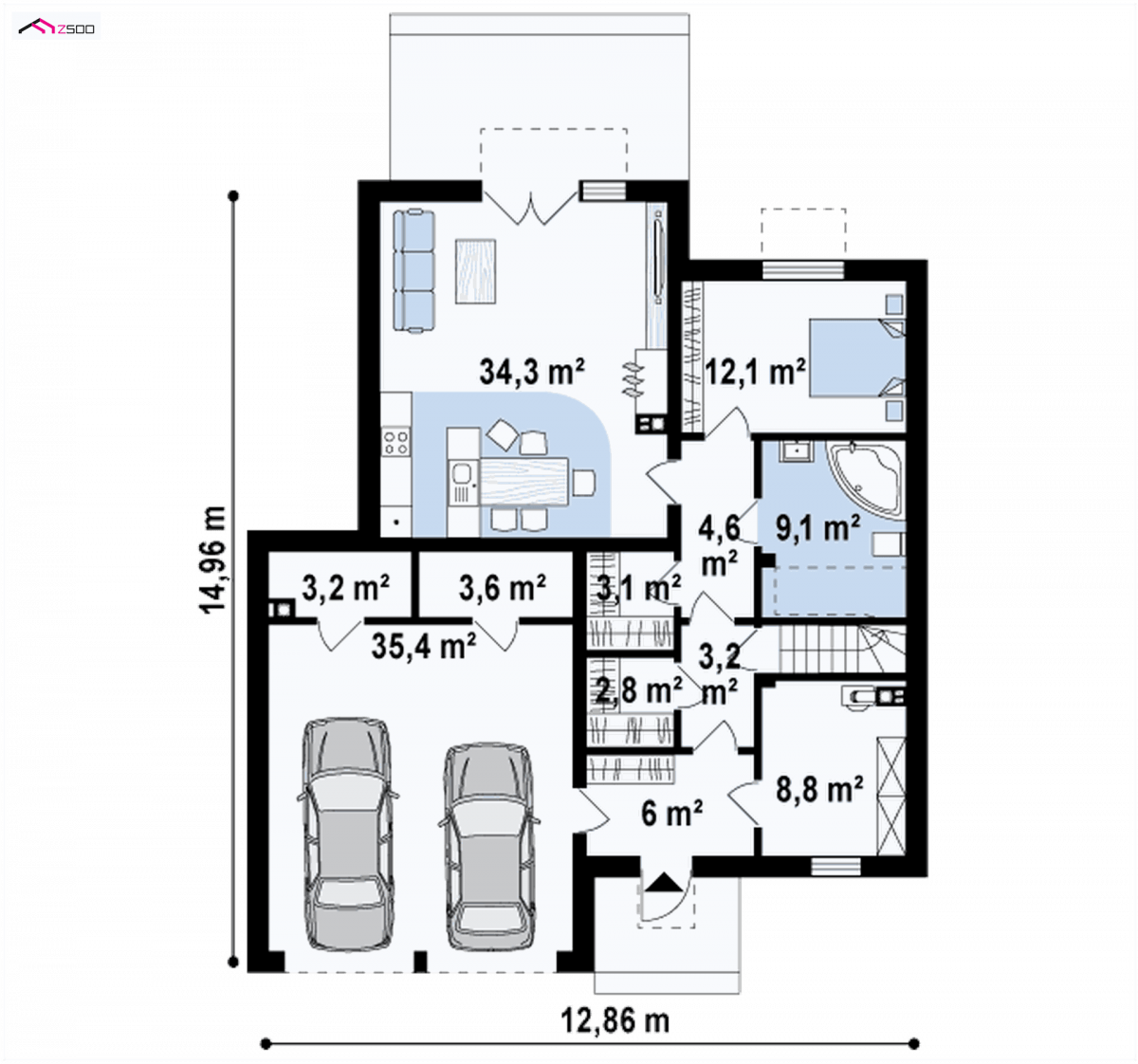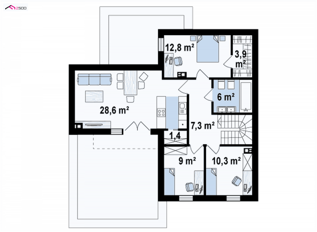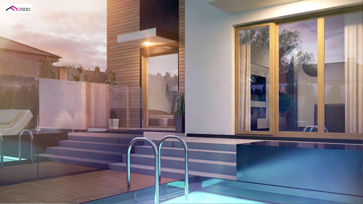 Zx120 is a two-storey, multi-story house with a double garage. It can be a two-family flat. Thanks to the unique ingenuity of the architect, it combines modern minimalism and functionality. The residence is perfectly adapted to the present day. It can become a two-generation home when you don’t want to climb stairs in old age, as well as the home of a young married couple. Separate wardrobes and 2 storage spaces in the garage make the house ideal for rent. The possibility of closing the ground floor and the floor next to the staircase separately is a valuable privacy that both the landlord and tenant will experience. And the loan is paid off by itself …