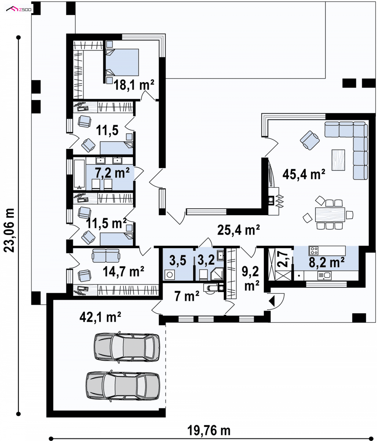 Since we have already raised the issue of “masculinity” and “femininity”, we should not forget to add that it is for this reason that two parking spaces have been designed in the garage. Jeno for “her”, second for “him”. However, the vibrant asset of the atrium remains undoubtedly the greatest asset of the described project. It is here in the quiet of greenery that we will be able to remember our family problems in the series: “- Sweetheart, the car won’t start” … “- And you refueled ??” … “