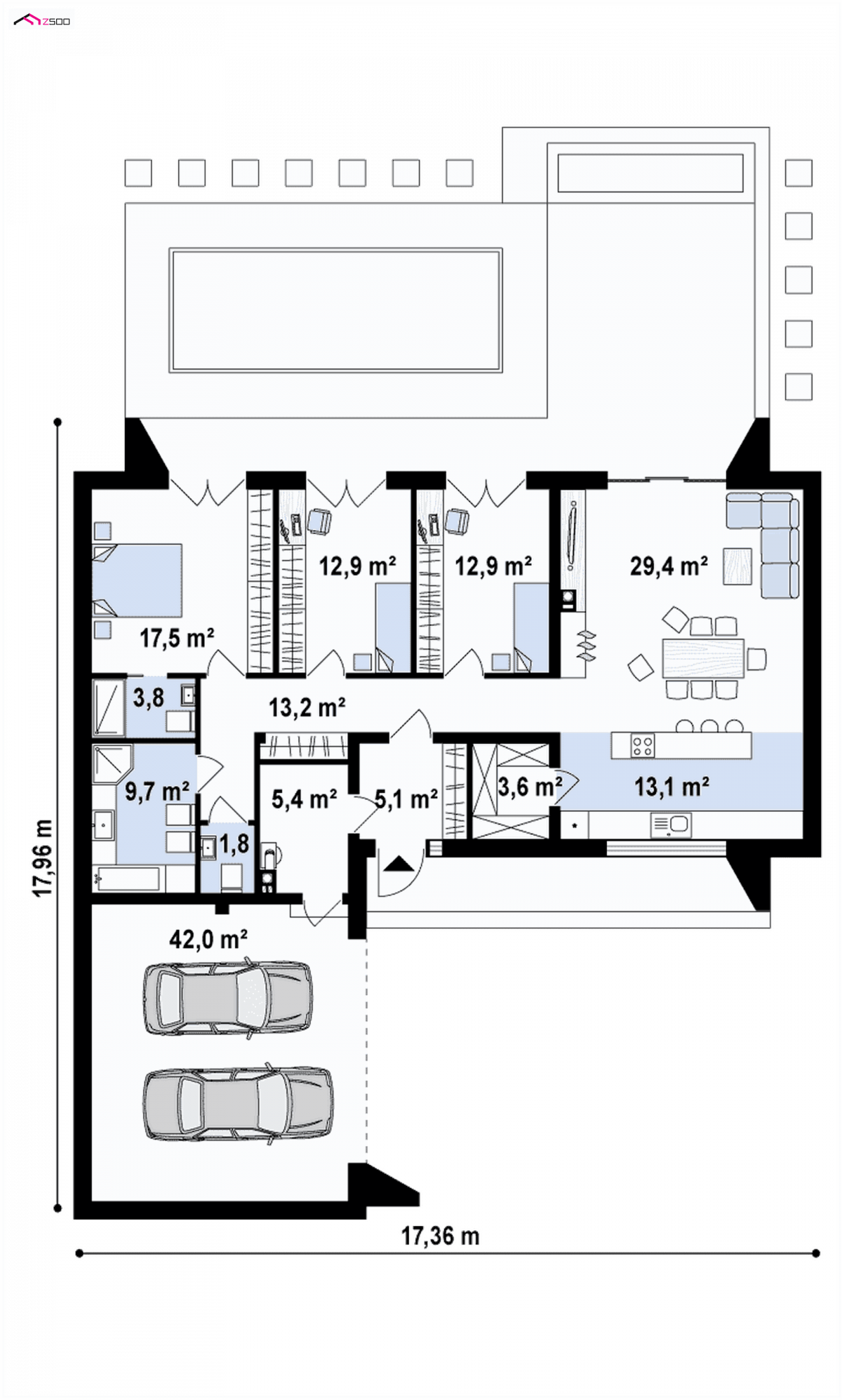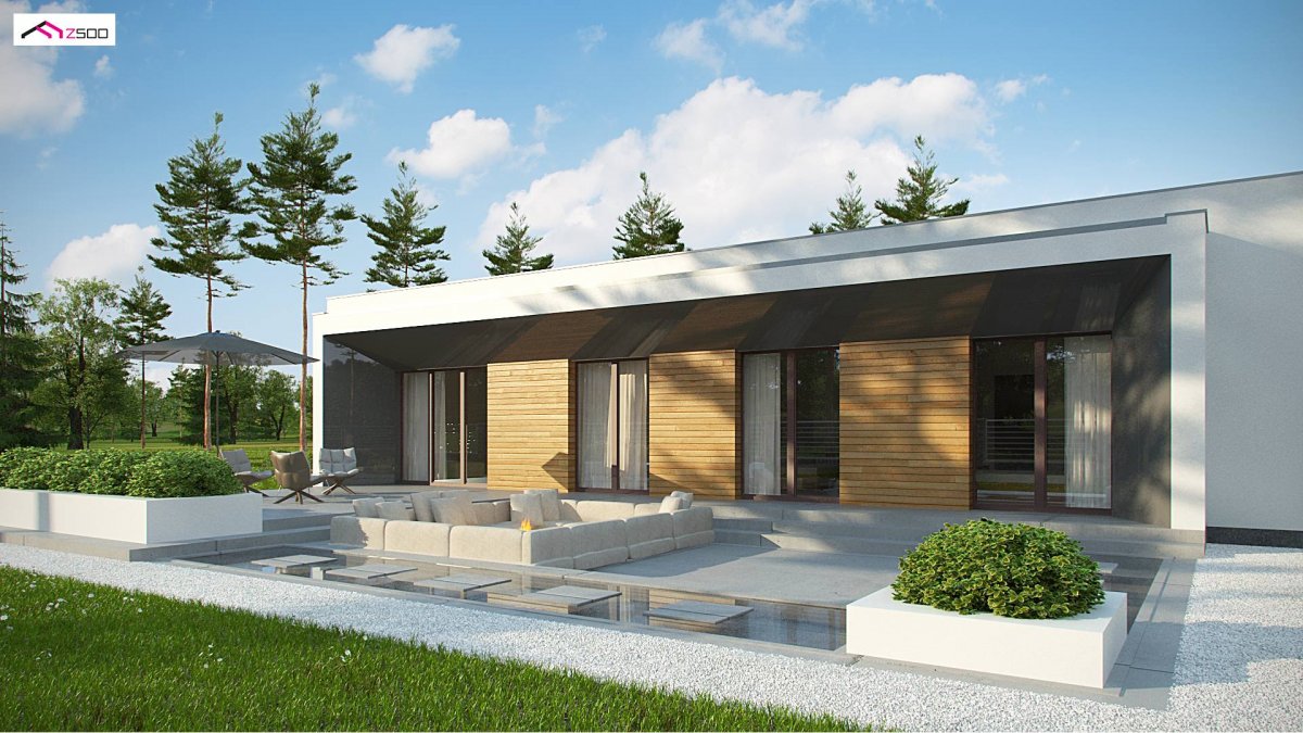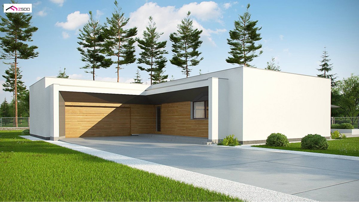 Zx135 is a modern, one-story house designed on the plan of the letter “L” with a double garage to which the gate can be placed on the front facade and a flat roof if necessary. Its white façade combined with large glazing in the form of portfolio windows give it the impression of elegance, cleanliness and neatness. The characteristic arcades emphasize the entrance zone and the recreation area located on the garden side.