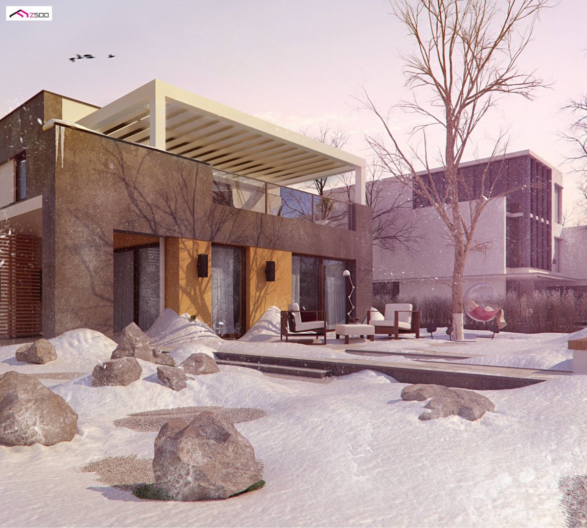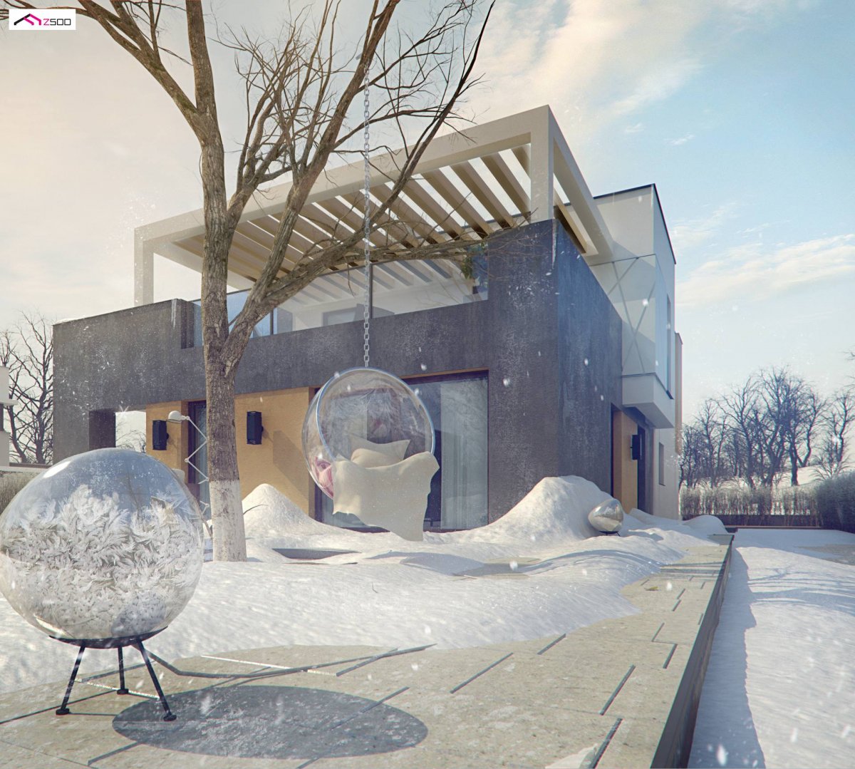 Zx45 2m is a unique two-story house in a modern style with two separately closed apartments with a single garage. An attractive body with a flat roof, functional interior and interesting finishing elements of the facade give it a peculiar look of artistry.