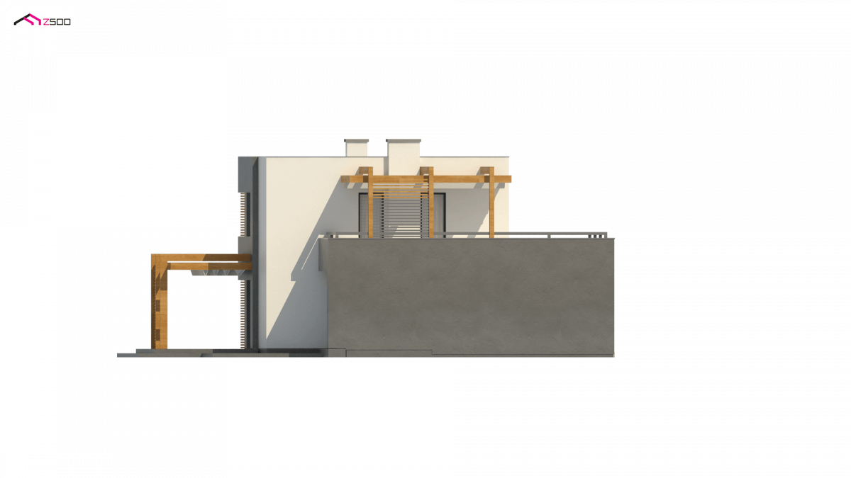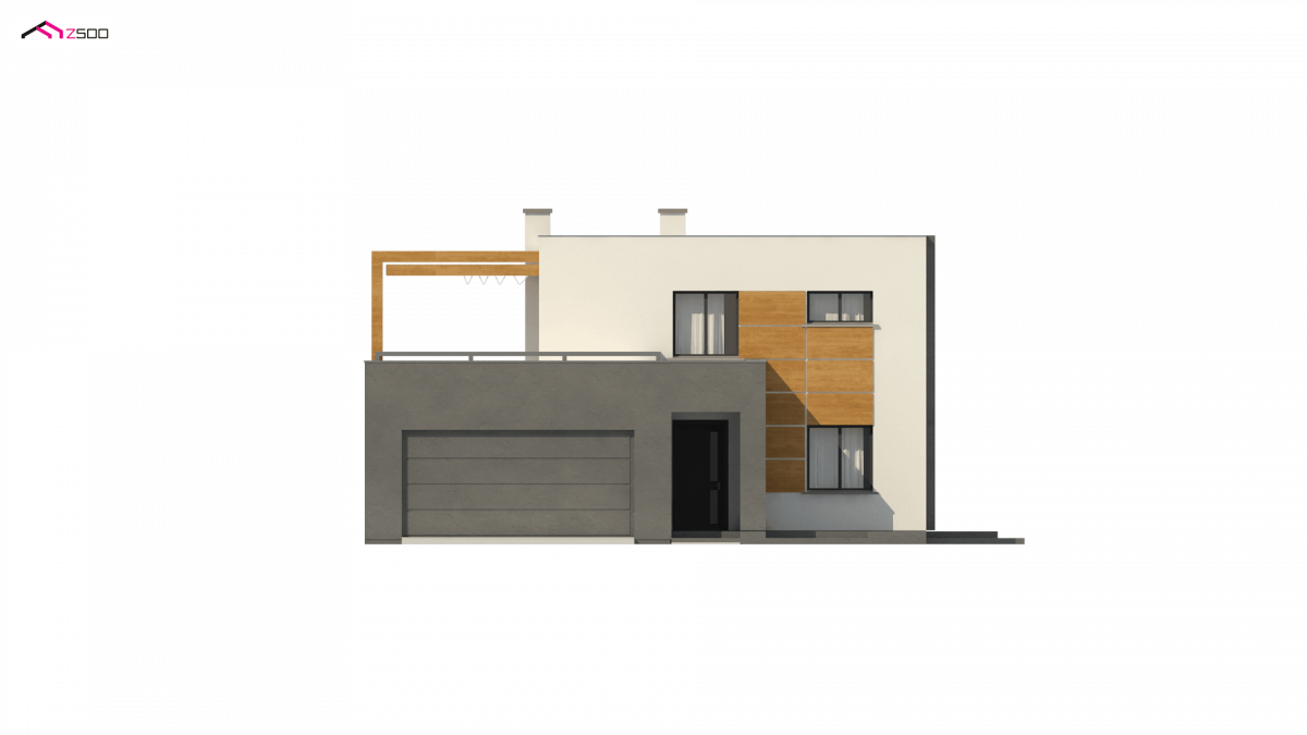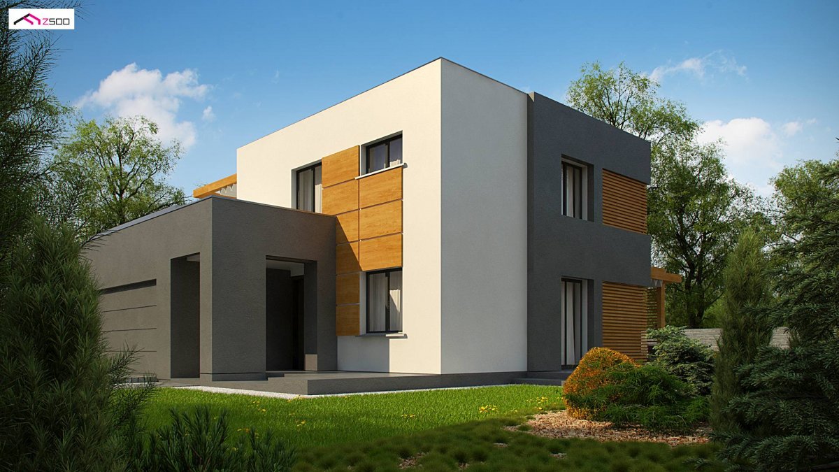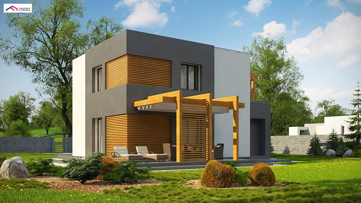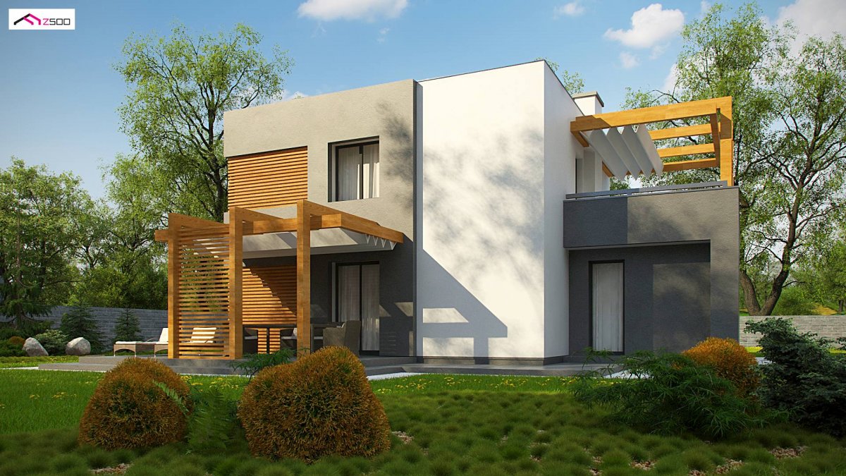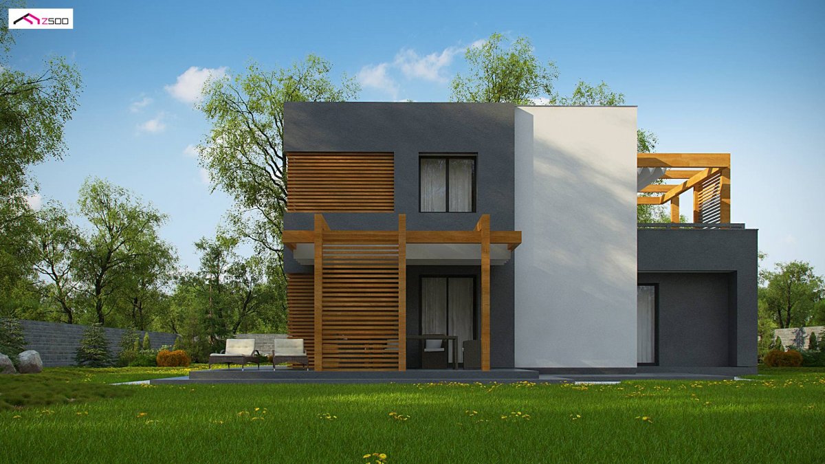 At first glance, it looks like an “ordinary block”, “simply” a cube. Covered entrance, white and gray colors with the addition of dark wood are decorative elements. The flat roof refers to popular Masovian cubes. His secret lies in terraces covered by a decorative wooden structure, which is a ready-to-buy roof system.