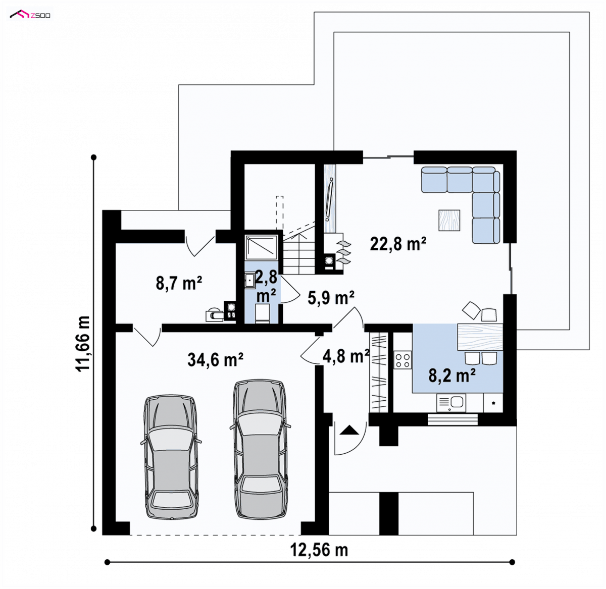 A small, compact single-family house, with a usable area of up to 100 m 2 with a 2 garage, perfect in terms of use as an MDM house.