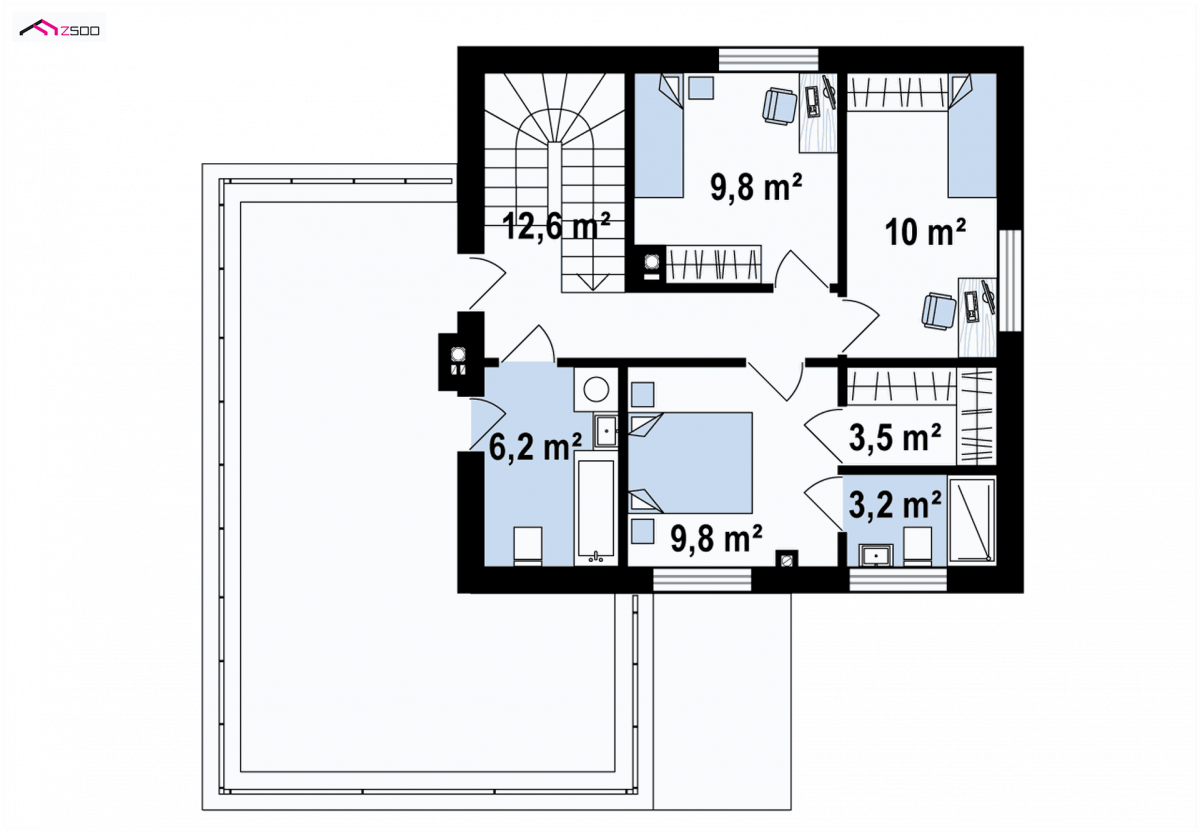 The first floor has 3 small bedrooms, one of which has its own private wardrobe and bathroom. The large terrace above the garage will allow you to experience a moment of relaxation after a hard day’s work. Unless we work at home? Then the terrace can be enriched with a table, deckchairs and all the necessary tools for work. An additional exit from the bathroom gives us the possibility of hanging the laundry directly outside. What associations? – beautiful smell of freshness of our bedding …