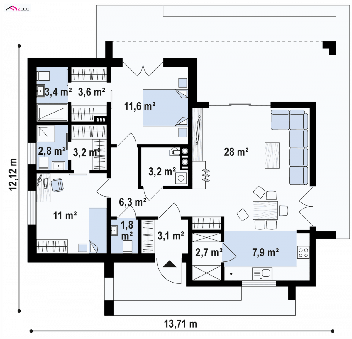 The ground floor is divided into two parts and it is like two rectangles – the living area – a kitchen located at the front, which together with a useful pantry can be separated by a partition wall from the living room and dining room. The centrally placed fireplace is perfectly visible from anywhere in the day zone. Large glazing will perfectly illuminate the interior of the room, and in addition provide an exit to the terrace, to the relaxation area.