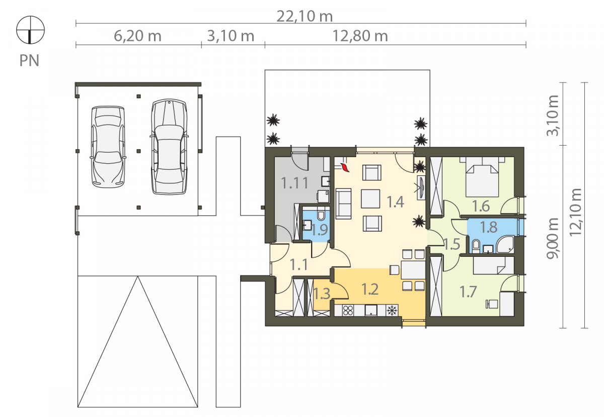 A small one-story house, designed for a family of 3-4, designed for a plot with entrance from the north or east.