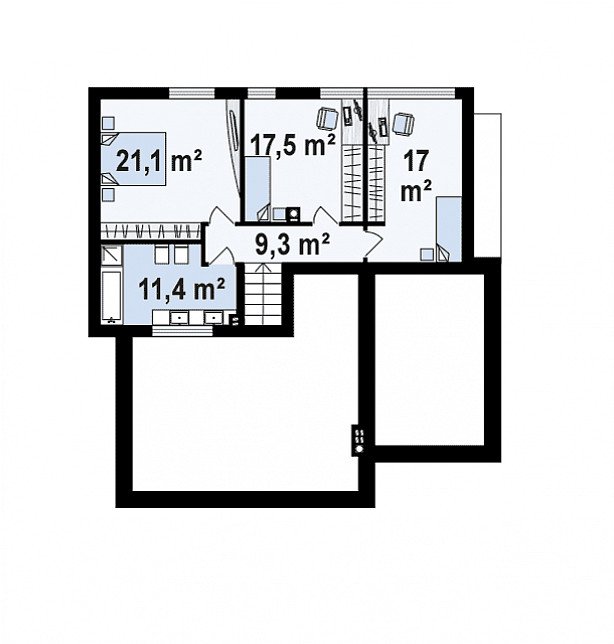 The first level contains a kitchen with a dining room and a room with a bathroom as a daily part of the house. A representative wide staircase leads down to the lower level where the living room with garden exit is located. It is intended to receive guests, so it always shines with purity so that we are not surprised by any unexpected visit. The study is intended as a bedroom for visitors. After opening the door adjacent to the office, a narrower staircase will lead us to the level where the basement is. We have a recreation room that we can arrange according to your needs and fantasies. The single-car garage is large enough to easily fit garden tools or a lawn mower. In the utility room, part of the space was allocated to the laundry room. This is a very practical solution, because thanks to the heat generated, the laundry dries much faster. However, from level “0” we have an entrance leading to the mezzanine, where there are 3 bedrooms. It depends on us which parents will occupy and which children will occupy.