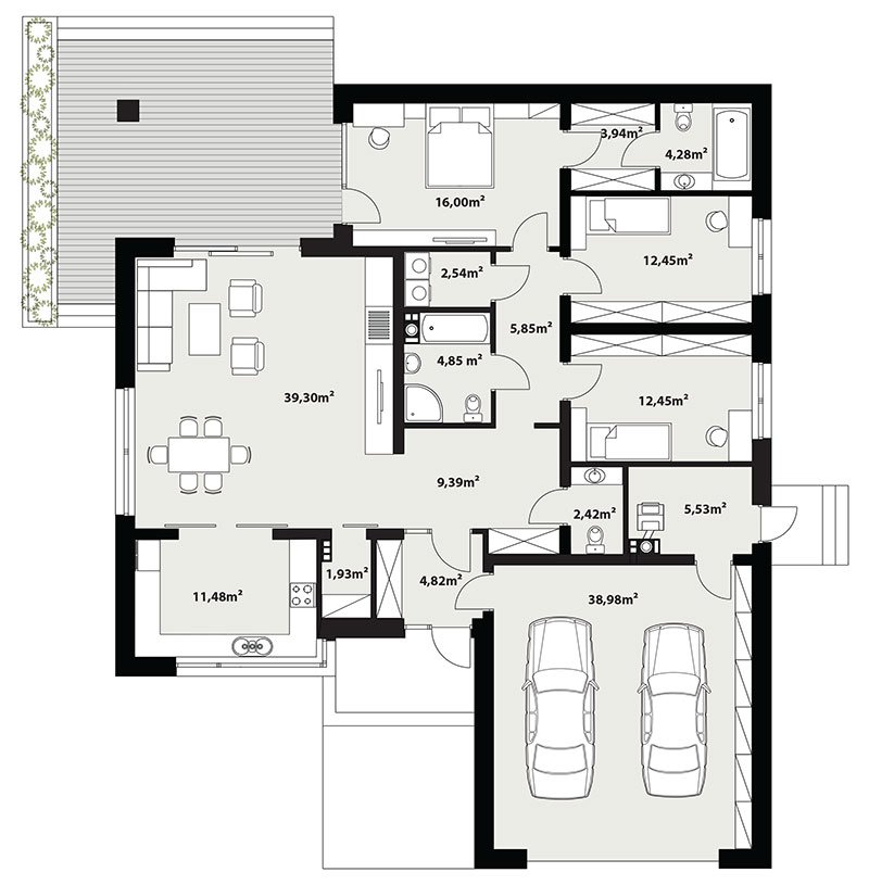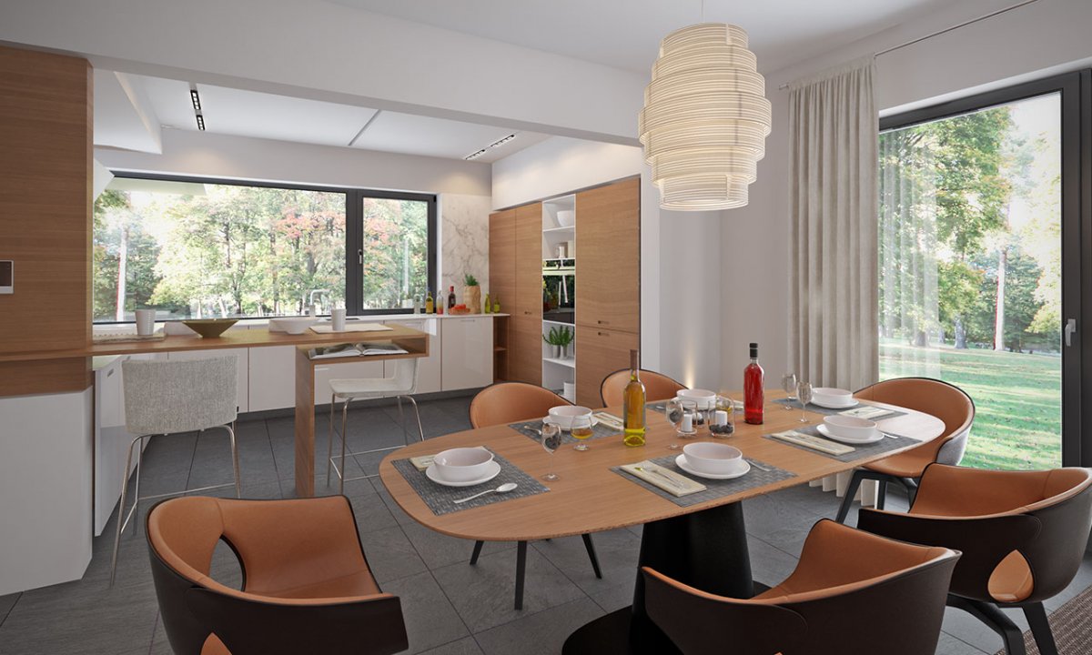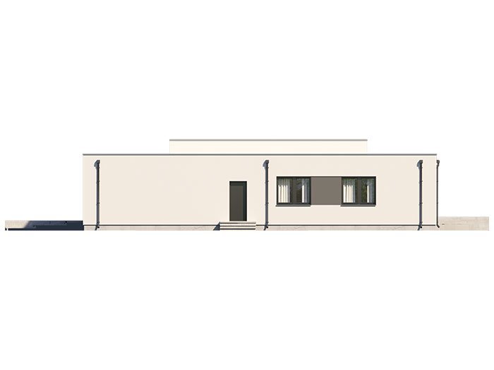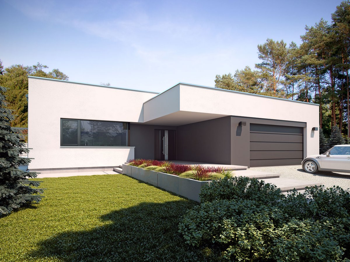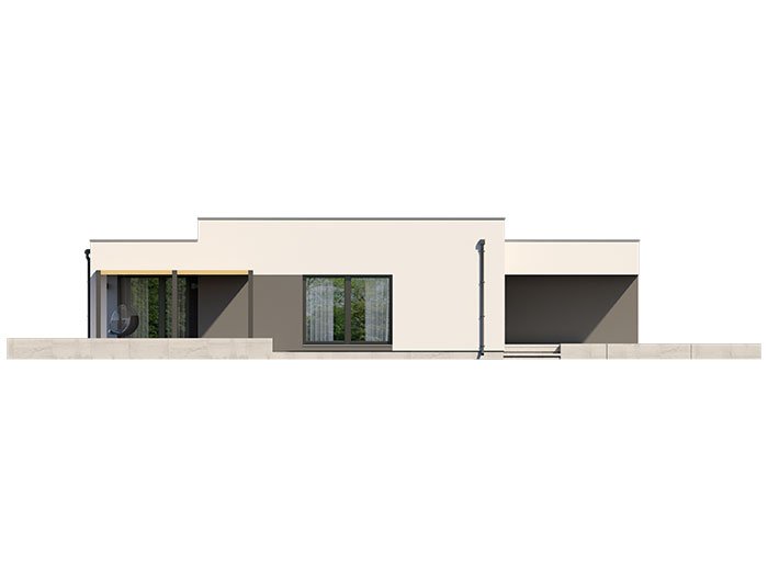 Atos is a modern, one-story single-family house, without a basement with a double garage, evoking the climate of modernist villas. It is a design proposal addressed to people who value minimalism in a contemporary edition. The simple body of the building was covered here with a flat roof, and the raw white facades were enriched with a subtle detail. Its full functional program ensures comfort and convenience for a family of four. The spacious living area is mainly created by the living room connected to the dining room and opening to the garden through huge glazing. The living area also includes a kitchen with a pantry. The spacious night area has 3 comfortable bedrooms and a bathroom. In addition, the master bedroom has its own wardrobe and bathroom. A rich economic zone has been designed in the house, which includes laundry room and large boiler room available from the garage, whose parameters allow the installation of the boiler for any type of fuel, including solid fuel. The advantage of the design is its simplicity both in the layout of the rooms, as well as in the solutions of the facade and the body.
