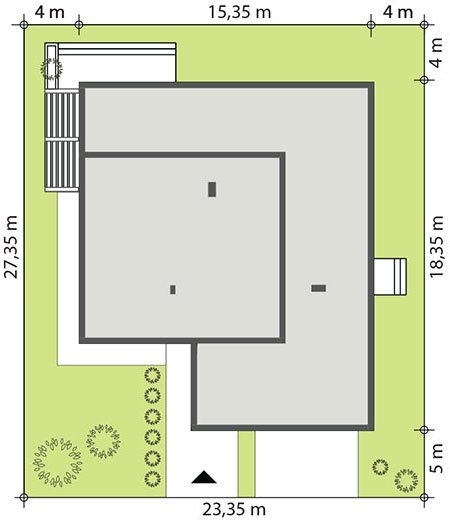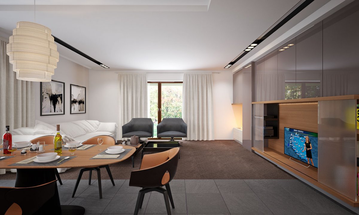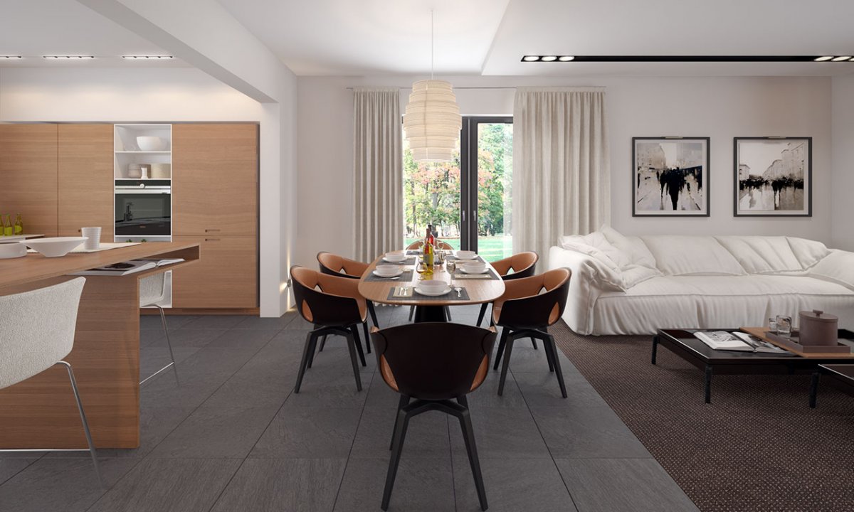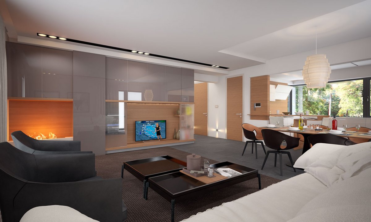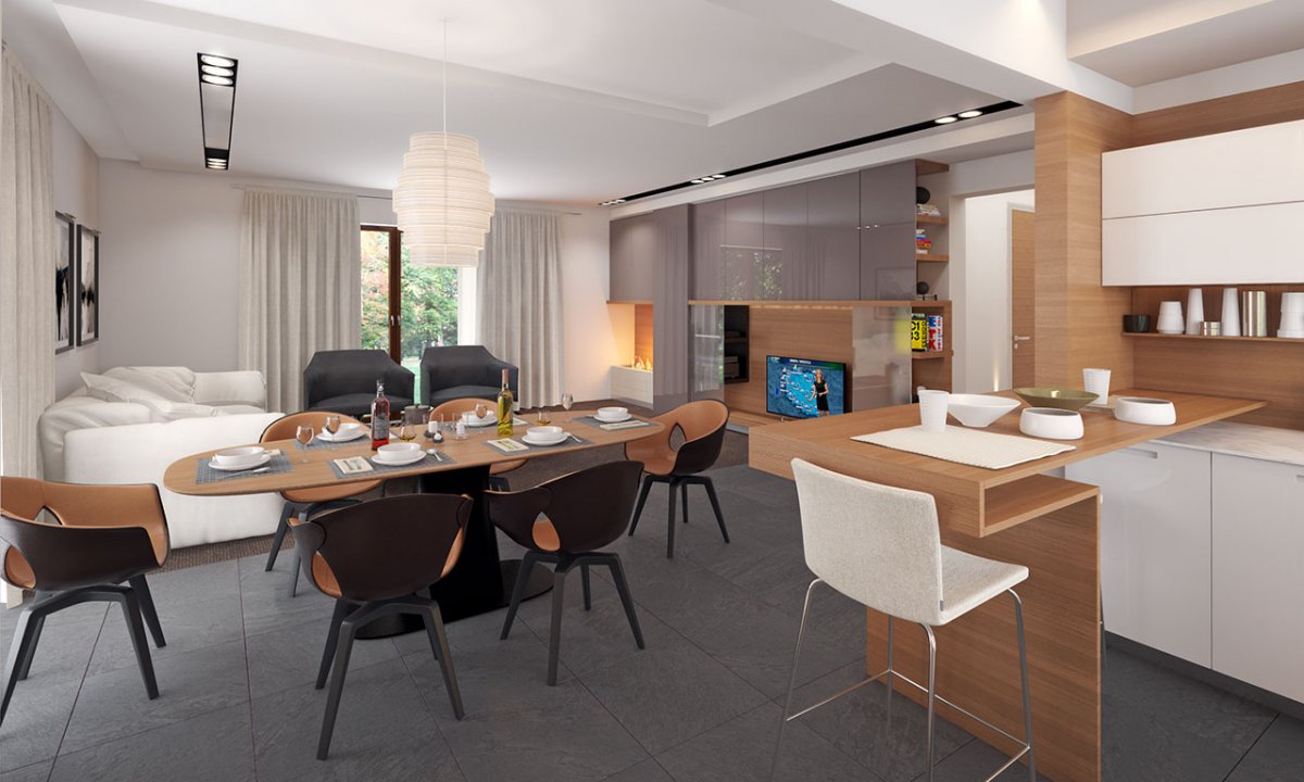 Atos is a modern, one-story single-family house, without a basement with a double garage, evoking the climate of modernist villas. It is a design proposal addressed to people who value minimalism in a contemporary edition. The simple body of the building was covered here with a flat roof, and the raw white facades were enriched with a subtle detail. Its full functional program ensures comfort and convenience for a family of four. The spacious living area is mainly created by the living room connected to the dining room and opening to the garden through huge glazing. The living area also includes a kitchen with a pantry. The spacious night area has 3 comfortable bedrooms and a bathroom. In addition, the master bedroom has its own wardrobe and bathroom. A rich economic zone has been designed in the house, which includes laundry room and large boiler room available from the garage, whose parameters allow the installation of the boiler for any type of fuel, including solid fuel. The advantage of the design is its simplicity both in the layout of the rooms, as well as in the solutions of the facade and the body.